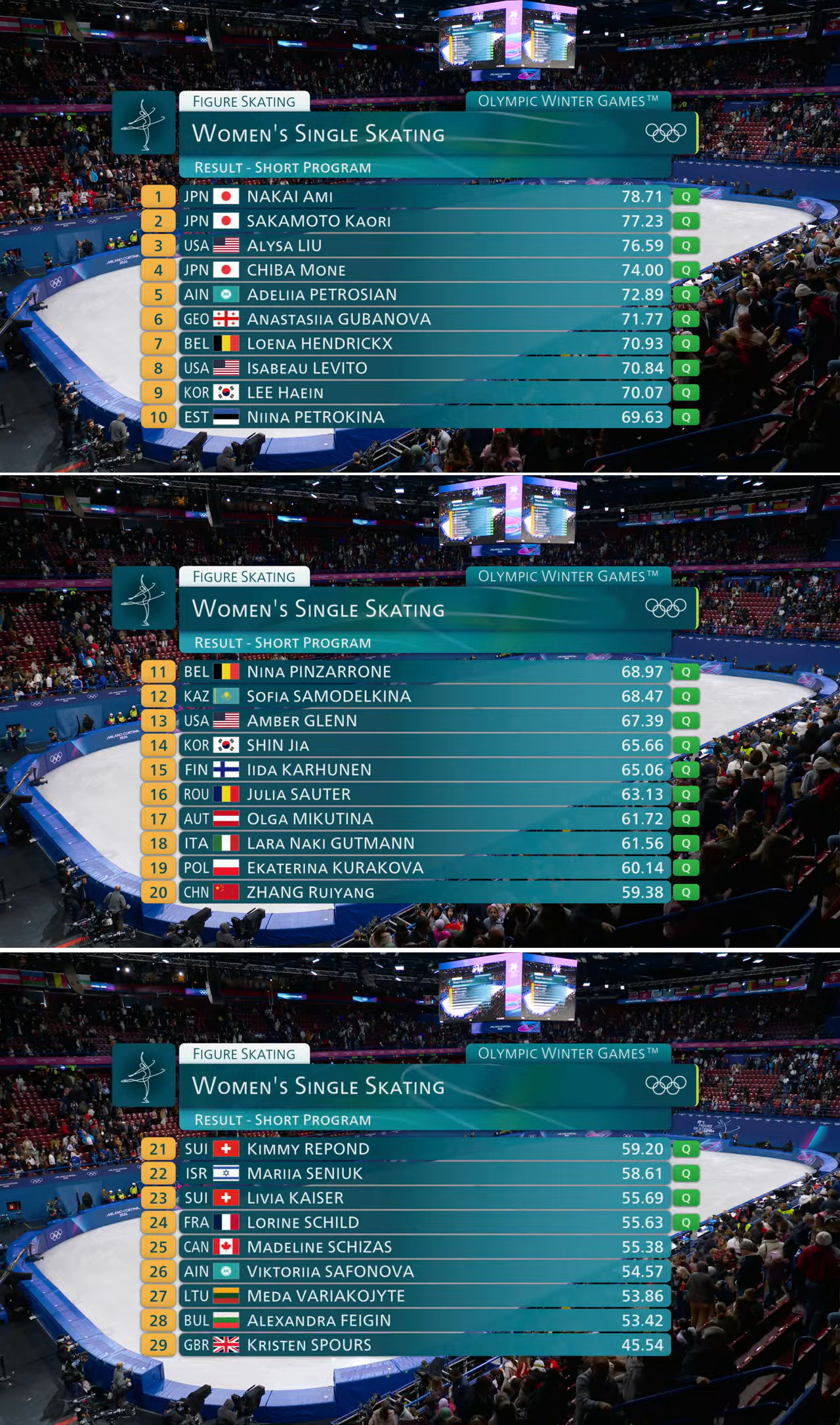>Women's Short Program Results:1. Ami NAKAI 78.712. Kaori SAKAMOTO 77.233. Alysa LIU 76.594. Mone CHIBA 74.005. Adeliia PETROSIAN 72.896. Anastasiia GUBANOVA 71.778. Isabeau LEVITO 70.84>Schedule:Thu 19 19:00 Women's Single Skating - Free Skating>Previous:>>153512485