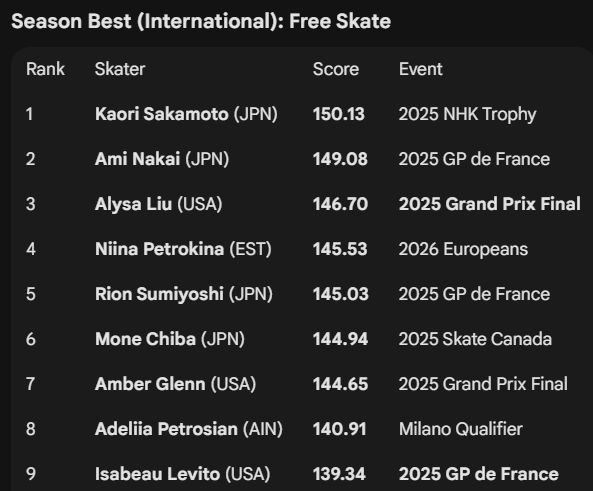 Levito, Liu and Glenn scored ~148-150 at US nationals (often friendlier judging). And Petrosian can score over 160 if she lands her quads.