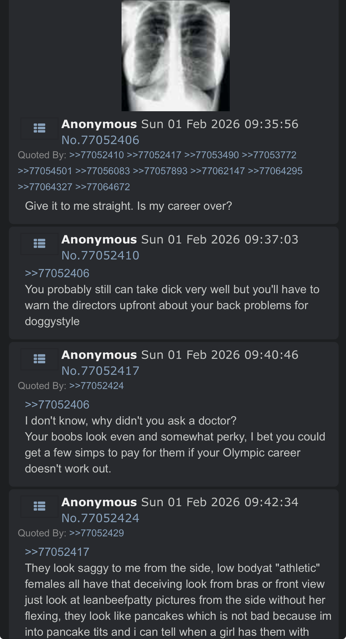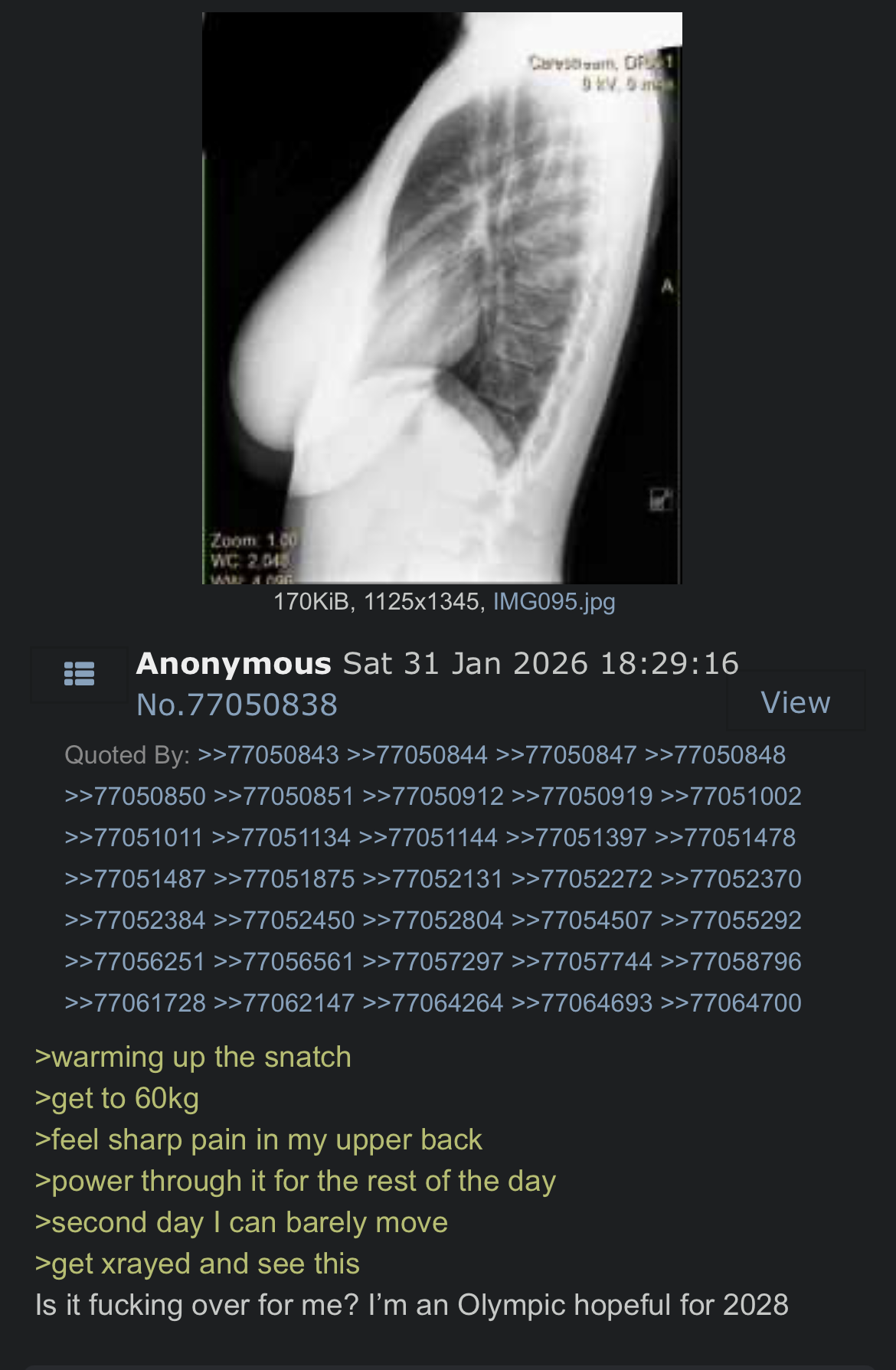 >>153537468>>153537482Holy shit, I hope she's ok and I'll be prepared to cheer for /ourgirl/ in 2028.If she ever comes back someone ask for details of what happens in the village. Always wanted to hear that straight from an Olympic anon.>>153538166>>153538217Holy based, iust say the general sport so we can cheer for one of our own. Also make a thread while you're there or after so we can know about the village.