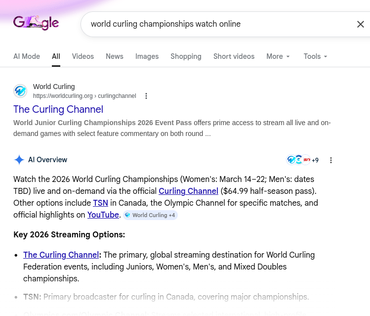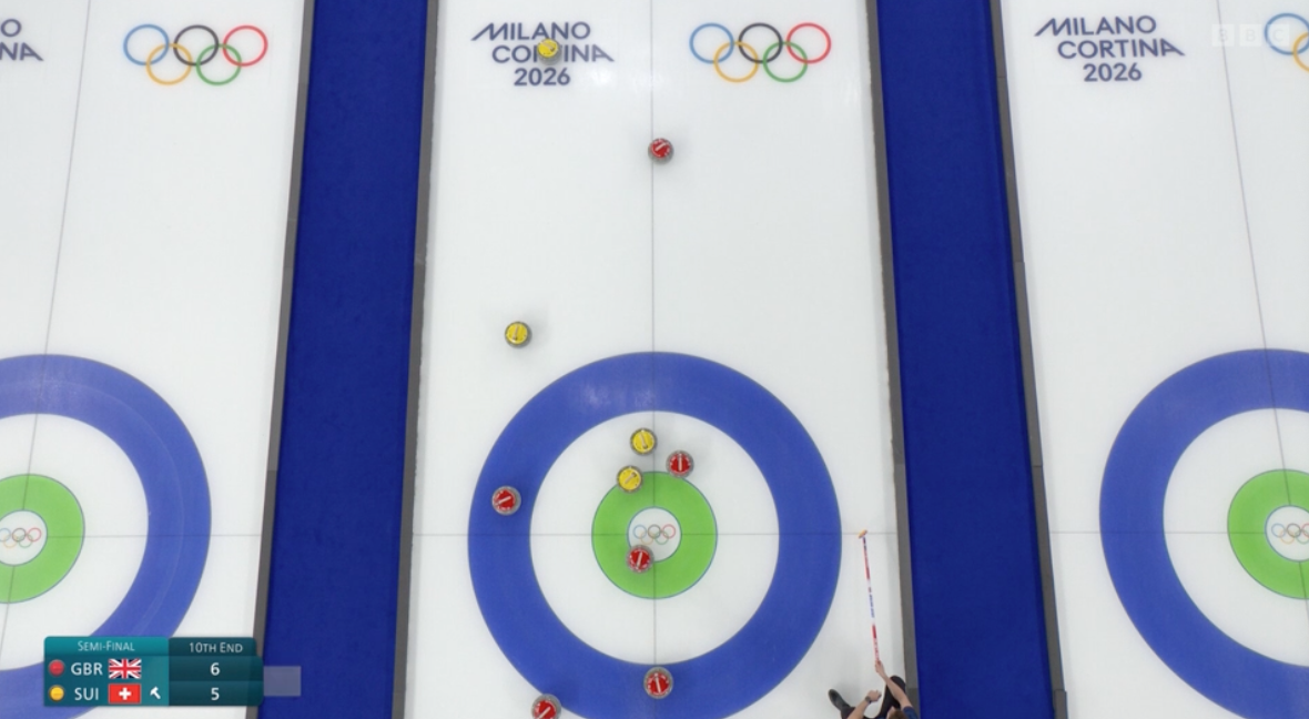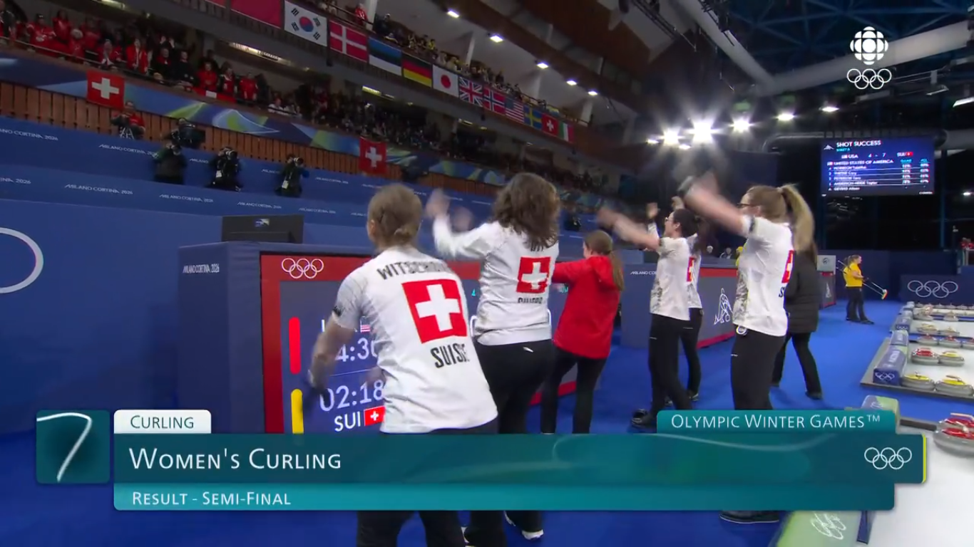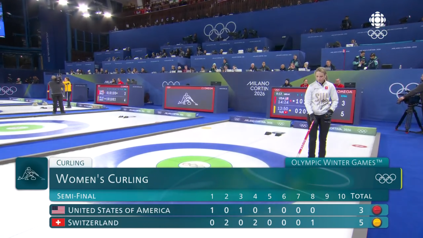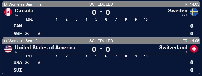 February 19[9:05]>Men's Session 12Sweden-Czechia (Sheet A)Italy-Switzerland (Sheet B)China-Germany (Sheet C)Norway-Canada (Sheet D)[12:05]>Women's Session 11Switzerland-United States (Sheet A)Canada-Korea (Sheet B)Japan-China (Sheet C)Great Britain-Italy (Sheet D)[19:05]>Men's Semifinal Sheet B>Men's Semifinal Sheet D>Men's schedule and standingshttps://www.olympics.com/en/milano-cortina-2026/results/cur/m/team4-------------/team-sports-schedule-eventhttps://www.olympics.com/en/milano-cortina-2026/results/cur/m/team4-------------/team-sports-groups-event>Women's schedule and standingshttps://www.olympics.com/en/milano-cortina-2026/results/cur/w/team4-------------/team-sports-schedule-eventhttps://www.olympics.com/en/milano-cortina-2026/results/cur/w/team4-------------/team-sports-groups-event