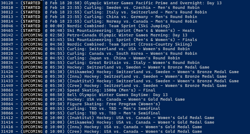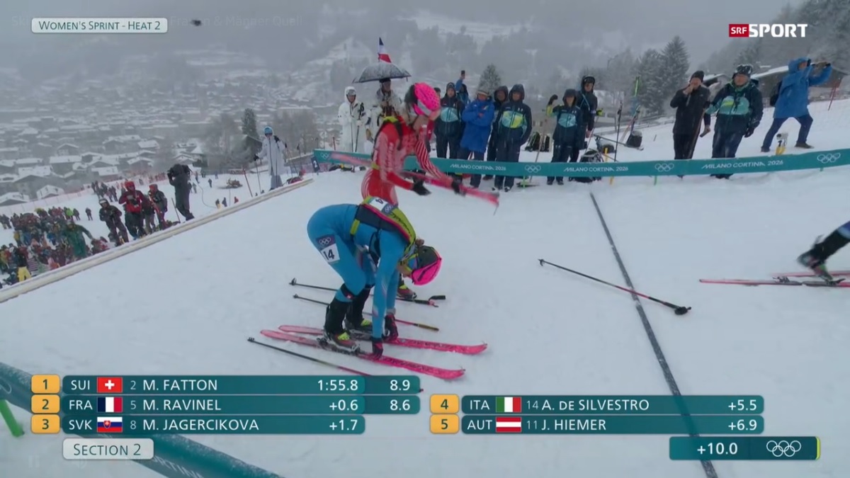 Women's Sprinthttps://www.olympics.com/en/milano-cortina-2026/results/smt/sp/w/sprint------------/heat/--------/race-result>09:50 CET - Women's Sprint Heats>12:55 CET - Women's Sprint Semifinals>13:55 CET - Women's Sprint FinalMen's Sprinthttps://www.olympics.com/en/milano-cortina-2026/results/smt/sp/m/sprint------------/heat/--------/race-result>10:30 CET - Men's Sprint Heats>13:25 CET - Men's Sprint Semifinals>14:15 CET - Men's Sprint Final