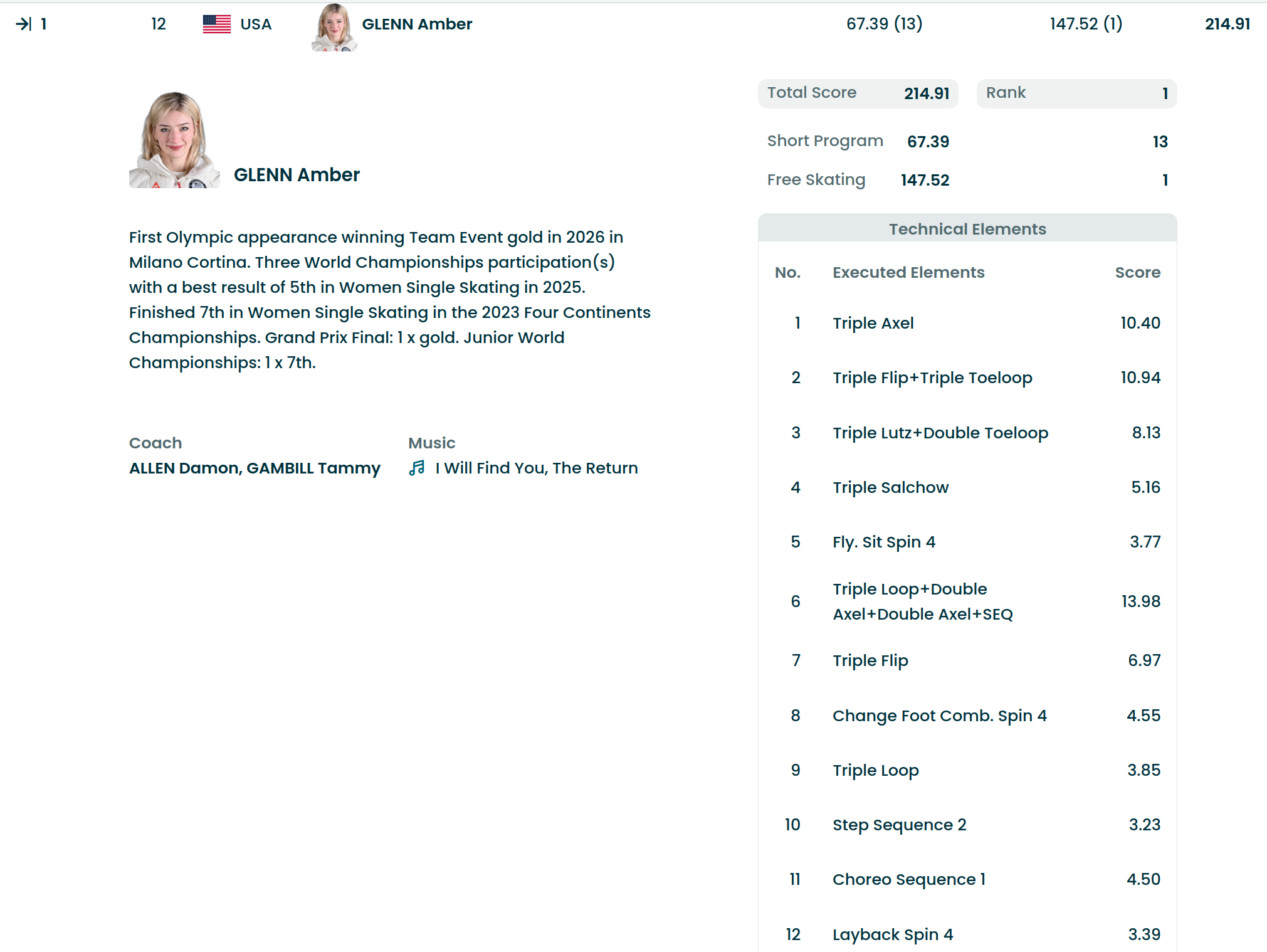 Amber will stay at first place until the top 4 enter.Isabeau will finish way behind Amber.She can barely land her simple jumps, she will retire after the Olympics, too many injuries.