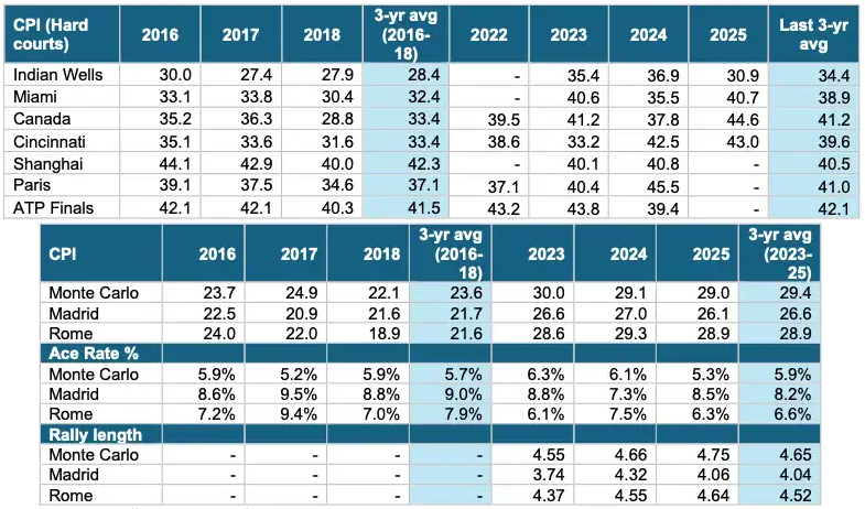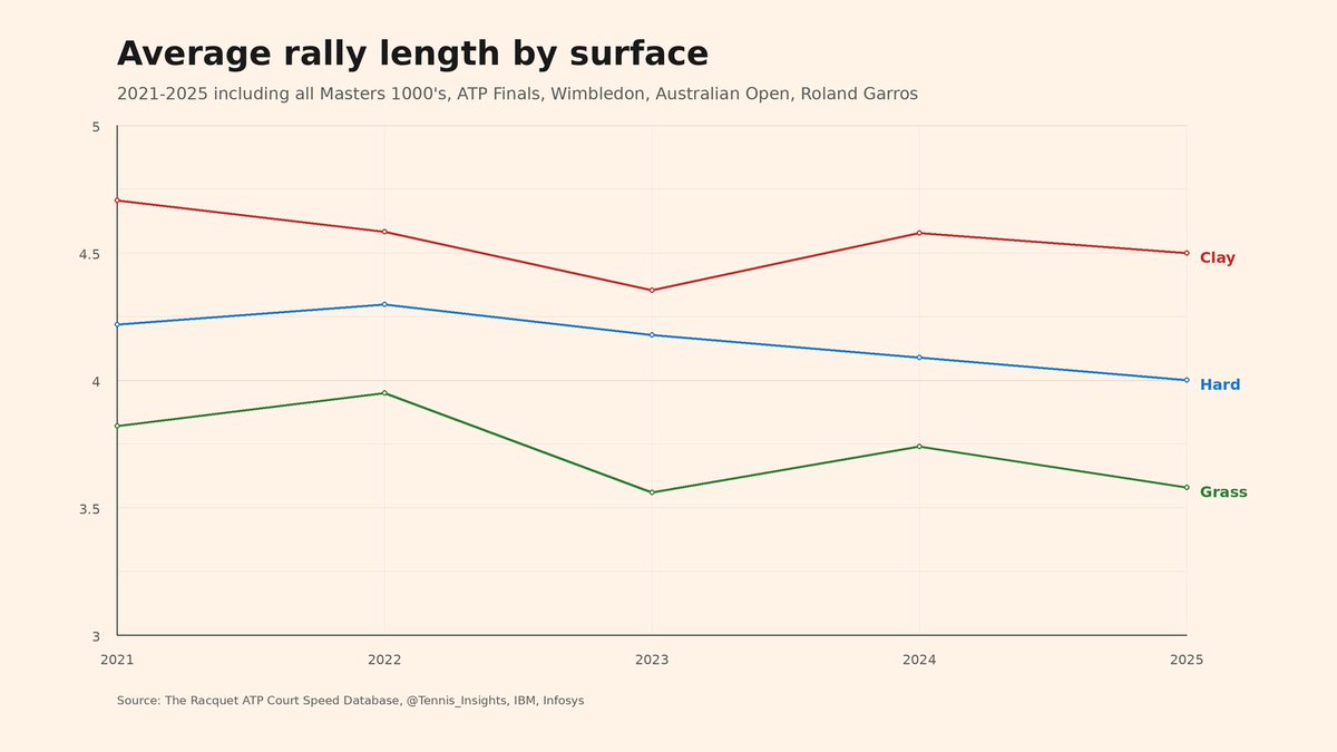 this idea keeps getting propagated around the internet for some reason. probably due to some pro player's casual unsubstantiated remark + people thought it sounded good in their head while forgetting what tennis was like 10 or more years ago (or simply didn't watch it), then it spread through xitter and r*ddit. but virtually all the data shows the opposite i.e. as a whole, courts are getting faster compared to several years ago. various approximate metrics like ace rate (e.g. tennisabstract SSR) and rally length support the trend too. even the ongoing IW event, notorious for decades for its old slow "basically clay" surface, swapped surface out for a faster one starting from last year