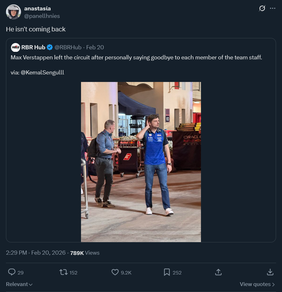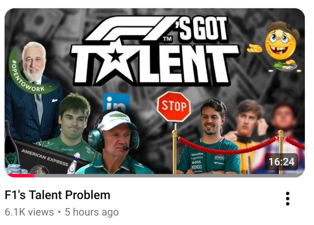 >Lap:#8350>Countdown to THE DEATH OF F1:https://f1exposure.com>Previous thread:>>153562666>/f1/ Essentials:https://pastebin.com/tZ67Gcuq>24/7 stream of the F1 Reviews from 1990-2009 (and possibly more F1-related content in the future):https://angelthump.com/gimi>Lewis Hamilton Grands Prix with Ferrari without scoring a podium:24>Toyota Gazoo Racing Haas F1 Team powered by Ferrari F1 Grands Prix without ever scoring a podium:215>Fernando Alonso F1 Grands Prix since last win:225 (224 starts)>2026 WDC Standings:GAS: 0COL: 0ALO: 0STR: 0ALB: 0>2026 WCC Standings:Alpine-Mercedes: 0Aston Martin Aramco-Honda: 0Atlassian Williams-Mercedes: 0Audi: 0Cadillac-Ferrari: 0>2026 WEC Standings:BOT: 0HAM: 0NOR: 0>News:Testin' is overAbo gyp in two weeks334 laps for AMR over six days:-an unspecified problem and a “data anomaly” last week-this week wednesday, a power unit issue, then a Stroll spin from possibly a technical fault-a battery-related problem thursday ending their running early in the afternoon session-six intermittent laps on friday-according to Newey doesn't even load the battery at 250 kW, let alone 350586 laps for Cadillac, might not be last672 laps for Red Bull, defied expectations, has Amx677 laps for Alpine, focused on pushing the car and less racing simulations, so who knows711 laps for Audi, looked unimpressive for 4 days, but made a lot of gains734 laps for Racing Bulls, solidly midfield, only 2026 rookie Lindblad redeemed741 laps for Mercedes, did show chinks (in its armor), probably cheating745 laps for Ferrari, showed a couple of innovations790 laps for Williams, had some catching up to do, also possibly overweight794 laps for Haas, looks like a swan, gentle to drive, fast over both short and longer stints817 laps for McLaren, don't think they're far behind Ferrari, MercedesAmx remembers