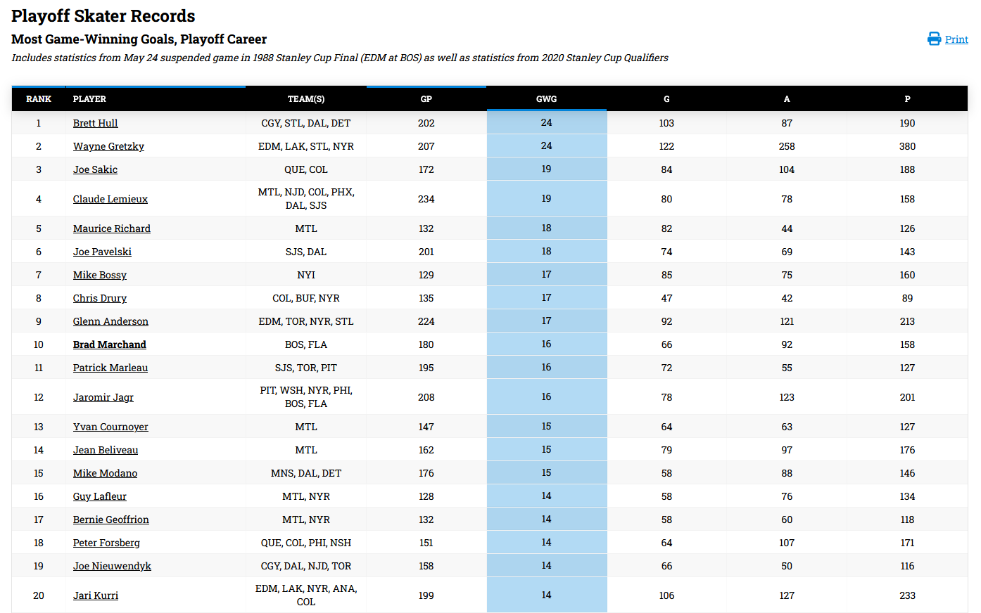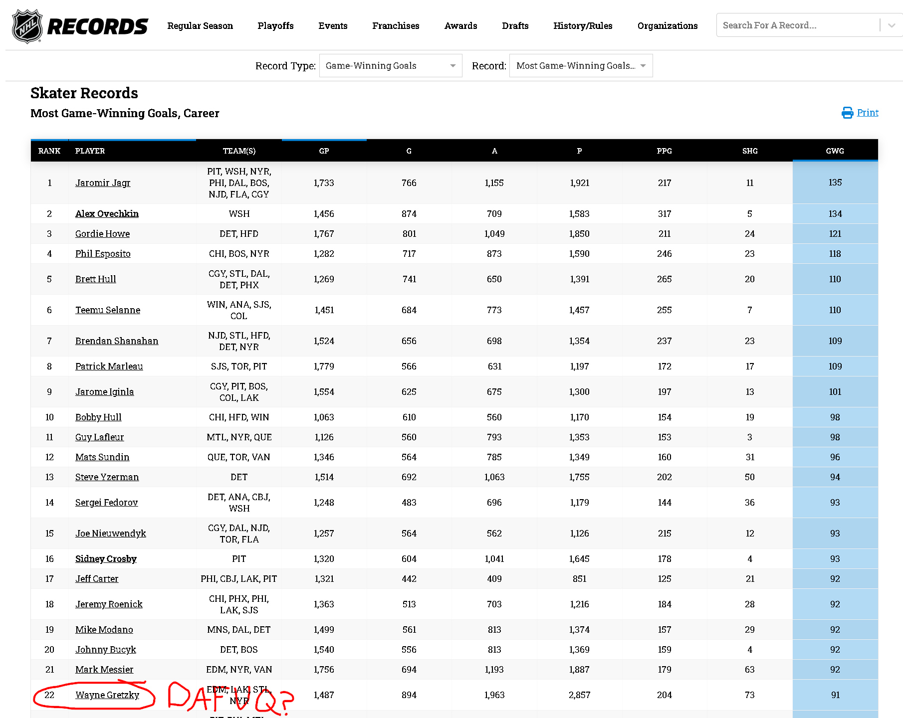 >>153579124Notice his points were all fake.Wasn't even close to the top 10 in GWGs.It was literally just to pump up a number for publicity and bugmen who love drooling over numbers.I like Gretzky. He was a fine player and seems like a good man.But his numbers are largely fake.