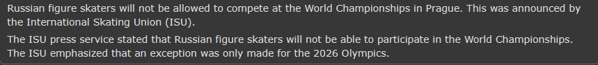 Now that the Olympics are almost over, how long do we think the ISU will take until it almost fully unbans Russians?The IOC allowing athletes to represent Russia in the Paralympics seems like a go ahead for sport governing bodies to start allowing them back in.I'm guessing they'll severely lower restrictions for the start of next season.