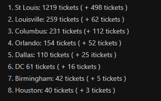 >>153890957>>153890640https://opensheet.elk.sh/1m6MgAlS-a5nPgfRii1eZJ8_IP2vnghHV_XLNbcOG9Xs/Sheet1 is the sheet they're using.1. STL: 1494 (+275)2: LOU: 340 (+81)3: COL: 329 (+98)4: ORL: 192 (+38)5: DAL: 139 (+29)6: DC: 69 (+8)7: BMH 68 (+26)8: HOU 46 (+6)