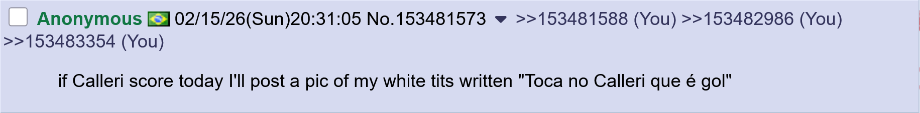 >>153626116Unlike you trikaschizo who has never even stepped foot in the stadium of the team of your city?