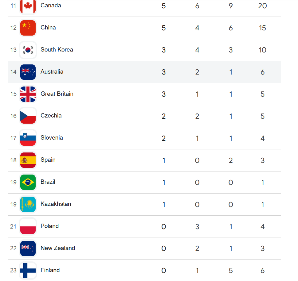 >Get less medals than Spain, Brazil and Australia