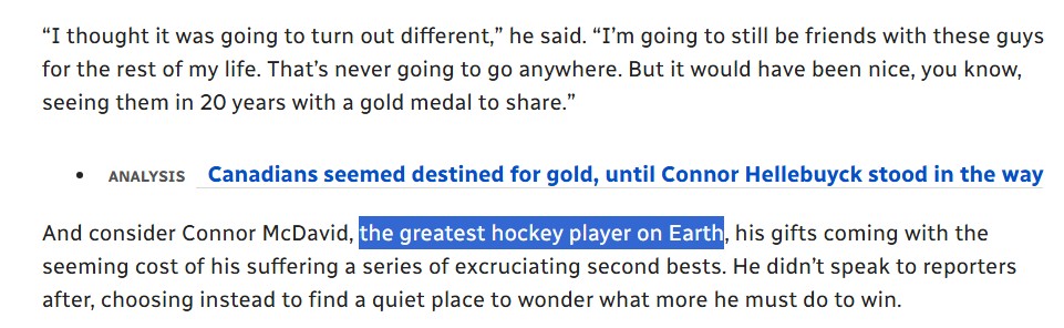 >McDavid's legacy will trying to heropuck a 1v3 situation then turning the puck over directly leading to the golden goal for the US