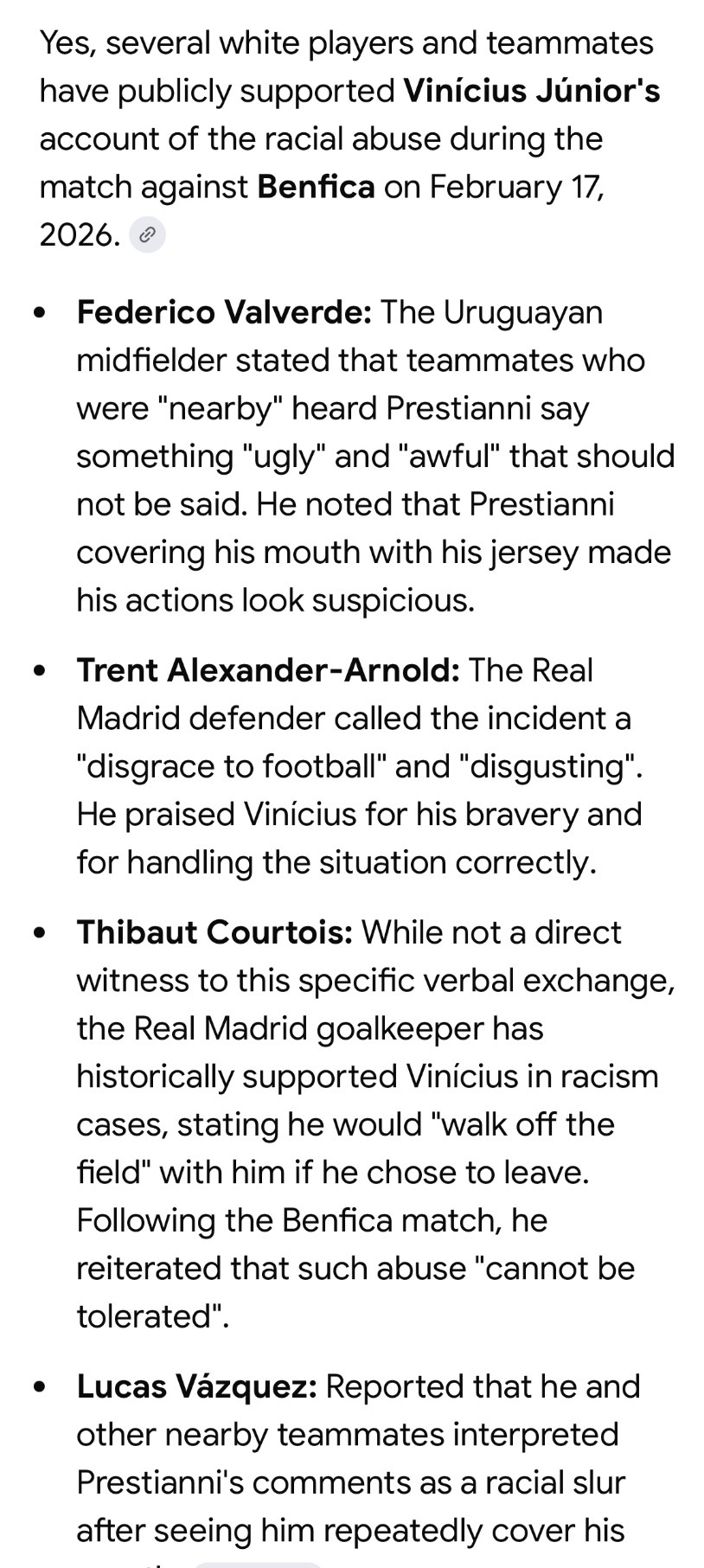 >Prestianni claim Vinícius Jr called him a dwarf>Homophobia as serious as racism, says Real Madrid's Courtois after Prestianni suspension