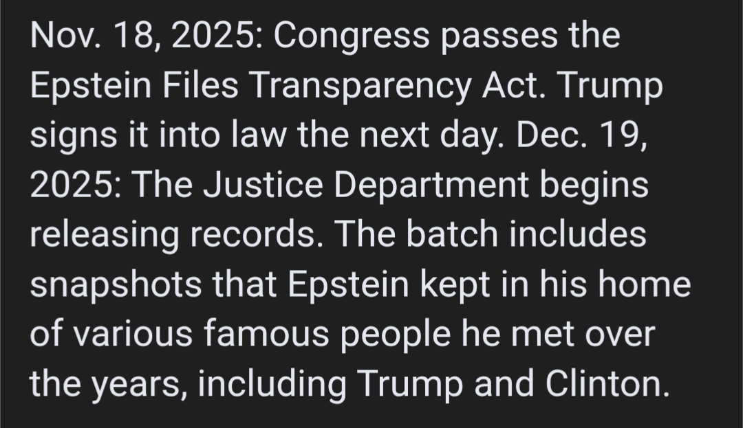 >>153652755>>153652782>>153652824Stop being stupid. Congress passed the EFTA 427-1 after Trump was blocking the release. Trump had no choice but to sign the bill into law because the vote was veto-proof. Then, Trump (via Bondi) violated the new law by withholding millions of files and over-redacting culprits' names (and revealing victims' names).