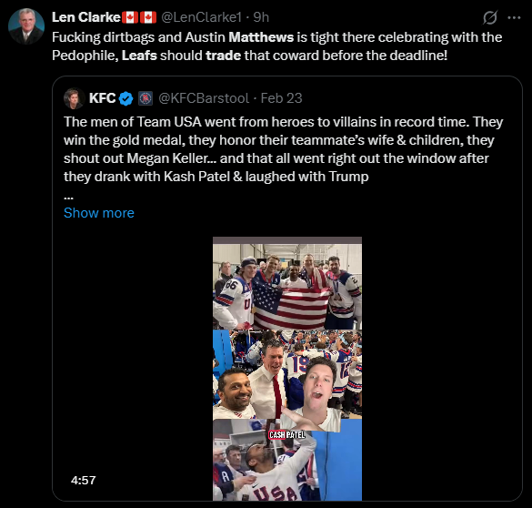 Brad Marchand and Sam Bennett were in the White House a month ago celebrating their Stanley cup win with President Trump and us as Canadians welcomed them both on team Canada with open arms during this Olympic cycle. Okay maybe not so much Bennett but my point still stands. I don’t see any posts about them being traitors to Canada and not allowing them on team Canada, as there’s posts to now letting Brady and Matthews back into Canada