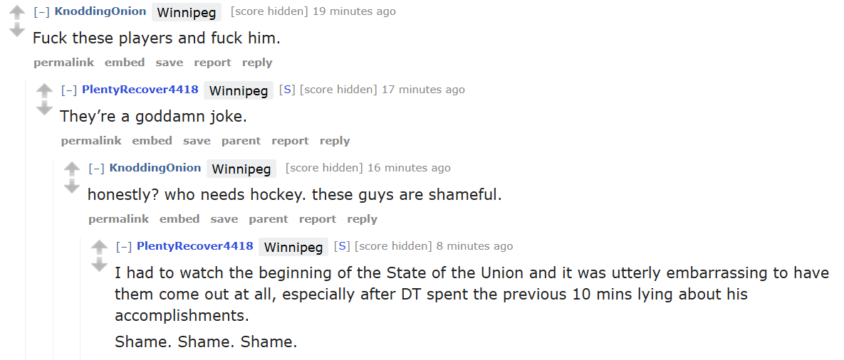 >>153658953>invadeare you retarded?sports and politics are inseparable at this point if you are a hockey fan, you are /pol/ according your standards