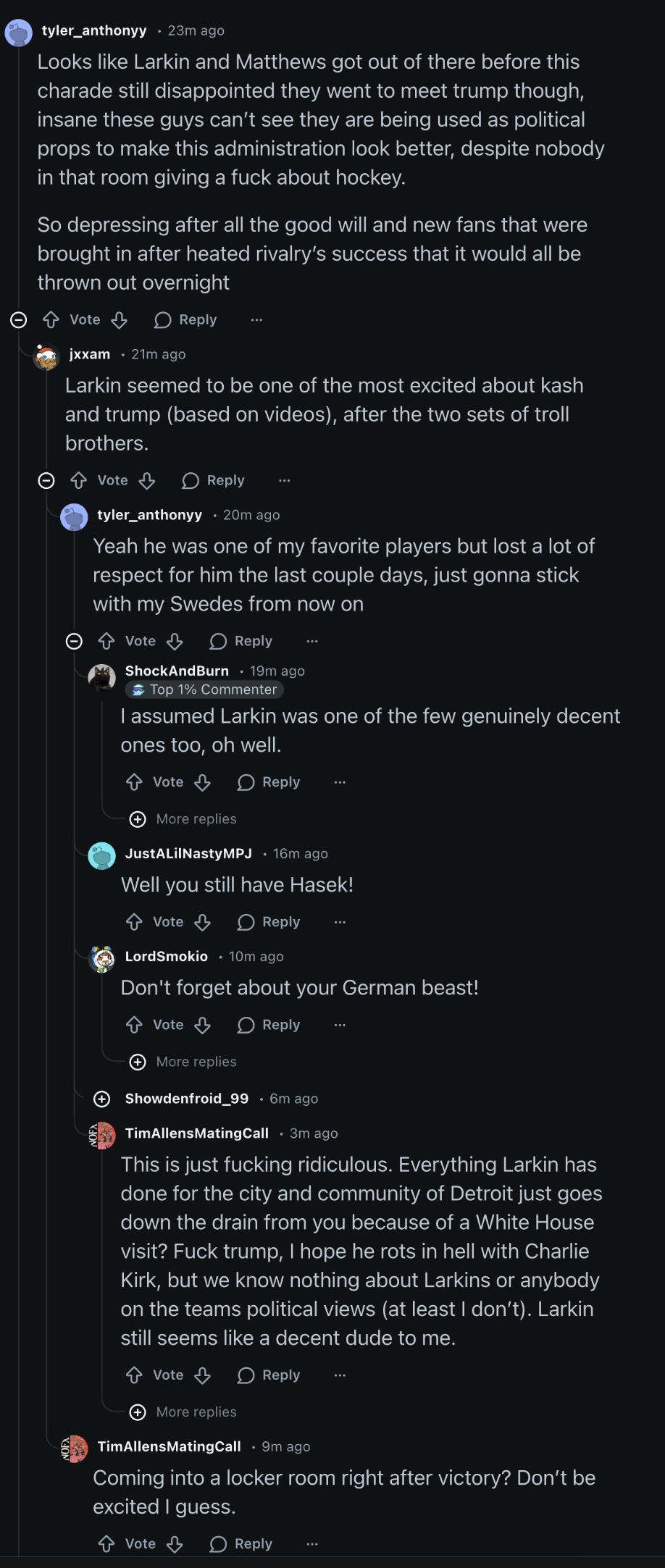 I told my wife when I saw the pictures that I was not surprised, just disappointed. I have never supported Trump, nor could I ever. Especially with his views on my wife (mtf) and I(cisF) existing.That being said, if I were in Slavin's shoes, I can't say that I would have come home instead of having the opportunity to visit the White House and meet the president. It's one of those once in a lifetime opportunities. I served as a page for both the NC House and NC Senate. My views have changed since then, but I didn't agree with the views of the Senator who sponsored me. I thought she was too liberal then, but also knew it was a great opportunity. (Yes, I'm sure I'll definitely get down voted for this)I hate he did it and it's definitely affected how I view him, but at the same time I don't plan on selling my jersey. I'm not mad, just sad and disappointed, ya know?