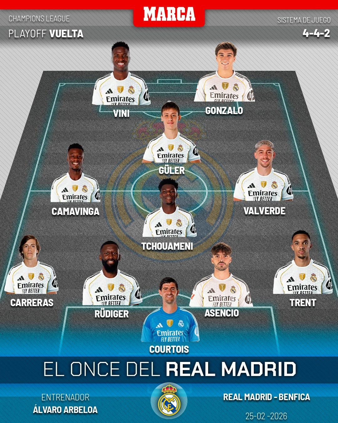 >Álvaro Arbeloa has made two changes to the starting eleven from Lisbon. Both are forced by the absences of Mbappé and Huijsen. Gonzalo replaces the Frenchman as the Madrid team's number 9. Asensio takes the place of the Spanish international in central defense.