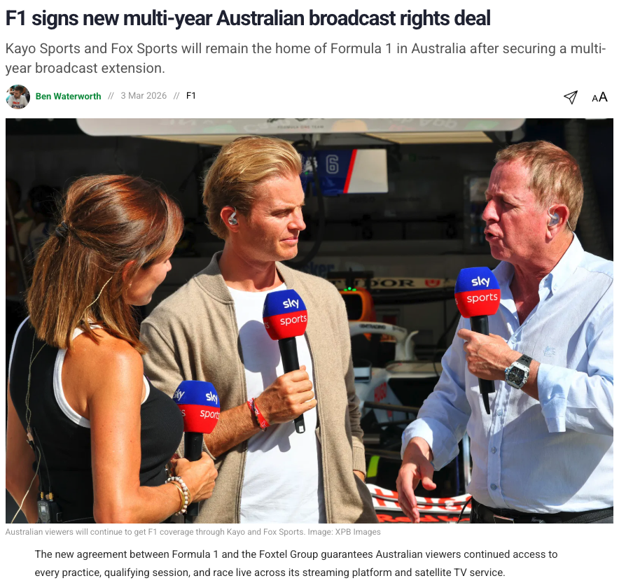 https://speedcafe.com/f1-news-2026-australian-broadcast-rights-deal-agreement-extended-kayo-foxtel-fox-sports-update/>Kayo Sports and Fox Sports will remain the home of Formula 1 in Australia after securing a multi-year broadcast extension.>Kayo Sports and Fox Sports will remain the home of Formula 1 in Australia after securing a multi-year broadcast extension.>Kayo Sports and Fox Sports will remain the home of Formula 1 in Australia after securing a multi-year broadcast extension.FUCK YOuFUCK YOUFUCK YOUI WANT f1tvFUCK YOUFUCK YOUFUCKING BOGANSFUCK YOU