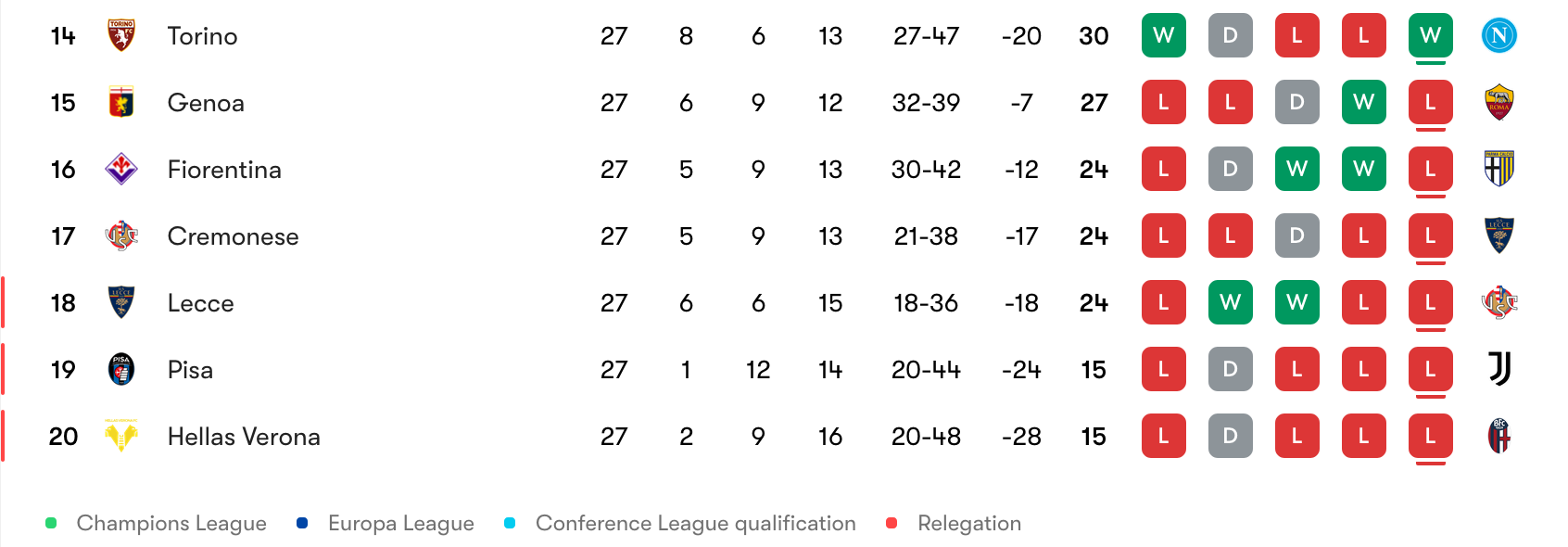 SERIE A ROUND 27>Friday 27th February 202620:45 Parma 1 - 1 Cagliari>Saturday 28th February 202615:00 Como 3 - 1 Lecce18:00 Hellas Verona FC 1 - 2 Napoli20:45 Inter 2 - 0 FC Genoa>Sunday 1st March 202612:30 Cremonese 0 - 2 AC Bbilan15:00 US Sassuolo 2 - 1 Atalanta18:00 Torino 2 - 0 S.S. Lazio20:45 AS Roma 3 - 3 Juventus>Monday 2nd March 202618:30 Pisa 0 - 1 Bologna20:45 Udinese 2 - 0 Fiorentina (65')COPPA ITALIA SEMI FINALS>Tuesday 3rd March 202621:00 Como - Inter>Wednesday 4th March 202621:00 S.S. Lazio - AtalantaReminder to keep it frosty, do NOT take your meds, drink a lot of water, count the mentions of your team in the thread, water your plants and stay tagliatellepilledPrevious: >>153695806