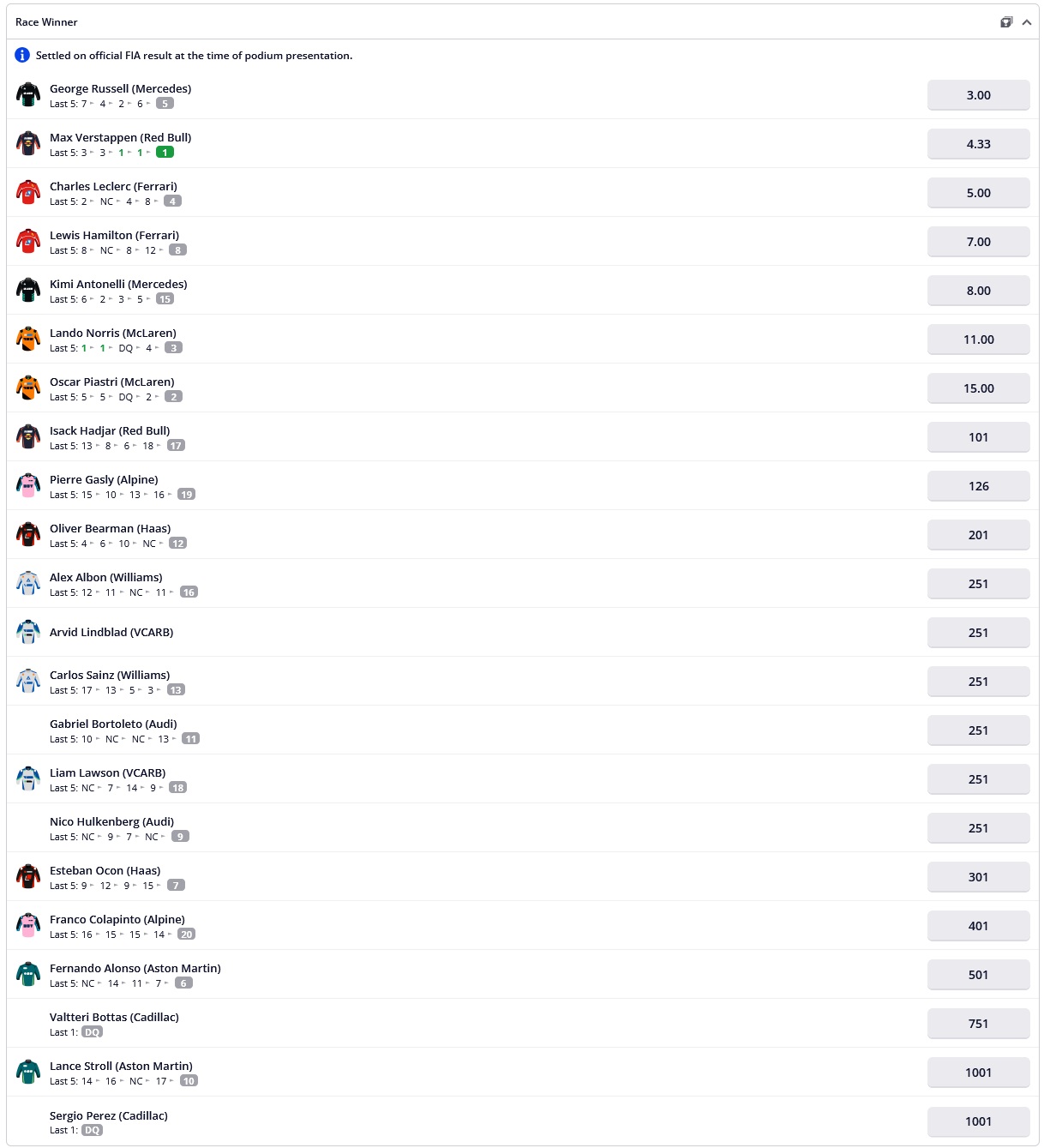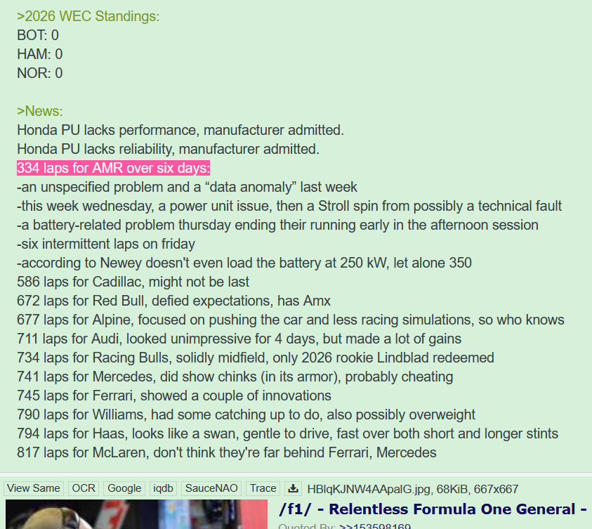 >Lap:#8355>Countdown to THE DEATH OF F1:https://f1exposure.com>Previous thread:>>153711467>/f1/ Essentials:https://pastebin.com/tZ67Gcuq>24/7 stream of the F1 Reviews from 1990-2009 (and possibly more F1-related content in the future):https://angelthump.com/gimi>Lewis Hamilton Grands Prix with Ferrari without scoring a podium:24>Toyota Gazoo Racing Haas F1 Team powered by Ferrari F1 Grands Prix without ever scoring a podium:215>Fernando Alonso F1 Grands Prix since last win:225 (224 starts)>2026 WDC Standings:VER: 10000000GAS: 0COL: 0ALO: 0STR: 0ALB: 0>2026 WCC Standings:Alpine-cheatcedes: 0Aston Martin Aramco-Honda: 0Atlassian Williams-cheatcedes: 0Audi: 0Cadillac-Ferrari: 0>2026 WEC Standings:BOT: 0washedmilton: 100000mickey mouse nowins: 100000>News:Max Verstappen voted as the GOAT of F1#mcpedocheats #mercedescheats#hondaloldogshit goatfucker GPs cancelled thank god!