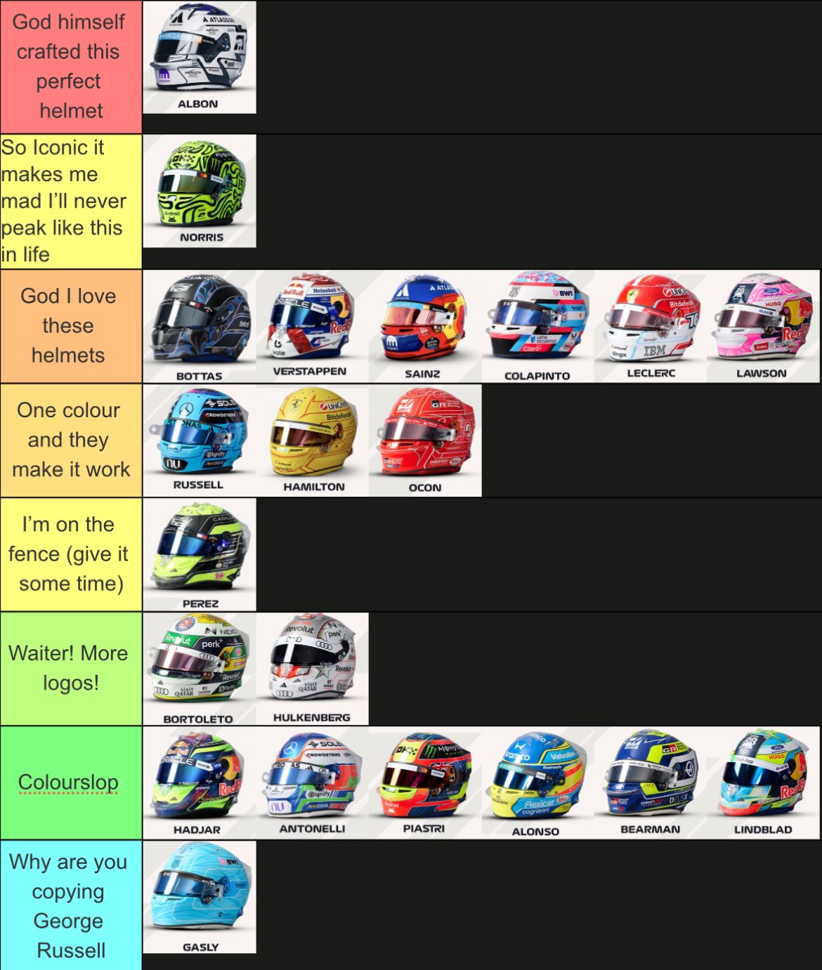 >>153727361It feels like drivers have a special edition helmet design every race now so what's the point of having a main one anymore