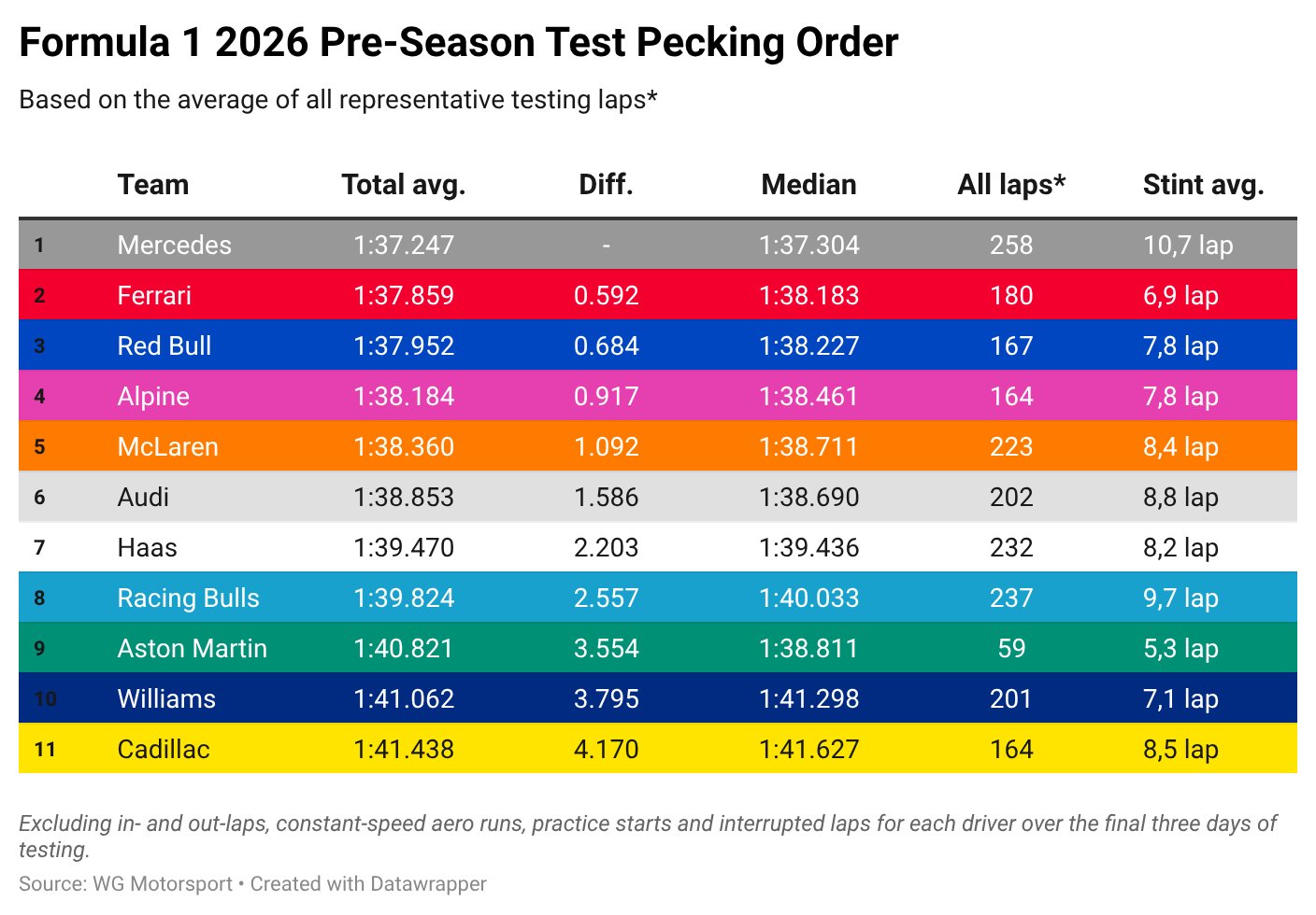 I know Mercedes is quickest but I didnt know it was this much. If you take the average of all representative test laps (no inlaps/outlaps) they are half a second faster than any other team.