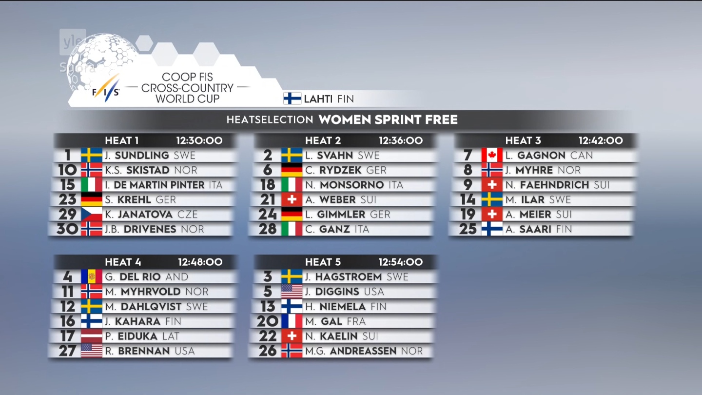 World Cup Edition>Fri 06.03.11.30 Alpine Skiing - W Downhill, Val di Fassa (ITA)12.00 Nordic Combined - W HS130, Lahti-Salpausselkä (FIN)13.00 Nordic Combined - M HS130, Lahti-Salpausselkä (FIN)16.00 Nordic Combined - W 5km, Lahti-Salpausselkä (FIN)16.35 Nordic Combined - M 10km, Lahti-Salpausselkä (FIN)17.10 Biathlon - M 20km Individual, Kontiolahti (FIN)>Sat 07.03.08.00 Cross-Country Skiing - Ski Classics - W Orsa Grönklitt ITT 50km, Orsa Grönklitt (SWE)09.00 Cross-Country Skiing - W + M Sprint Qualification Free, Lahti-Salpausselkä (FIN)09.30 Alpine Skiing - M Giant Slalom 1st Run, Kranjska Gora (SLO)10.15 Nordic Combined - Mixed Team Sprint HS130, Lahti-Salpausselkä (FIN)10.45 Alpine Skiing - W Downhill, Val di Fassa (ITA)11.30 Cross-Country Skiing - W + M Sprint Final Free, Lahti-Salpausselkä (FIN)12.30 Alpine Skiing - M Giant Slalom 2nd Run, Kranjska Gora (SLO)13.40 Biathlon - W 12.5km Mass Start, Kontiolahti (FIN)14.30 Piggy Jump - HS130, Lahti-Salpausselkä (FIN)14.30 Nordic Combined - Mixed Team Sprint xkm, Lahti-Salpausselkä (FIN)15.40 Biathlon - M 4 x 7.5km Mass Start, Kontiolahti (FIN)17.00 Ski Jumping - HS130, Lahti-Salpausselkä (FIN)Previous thread: >>153712607
