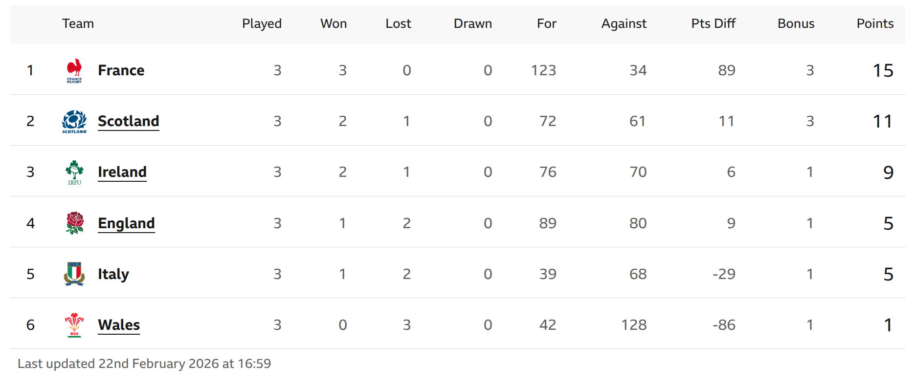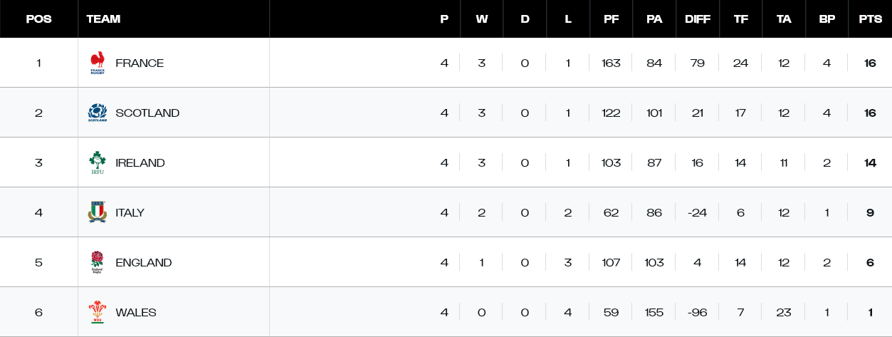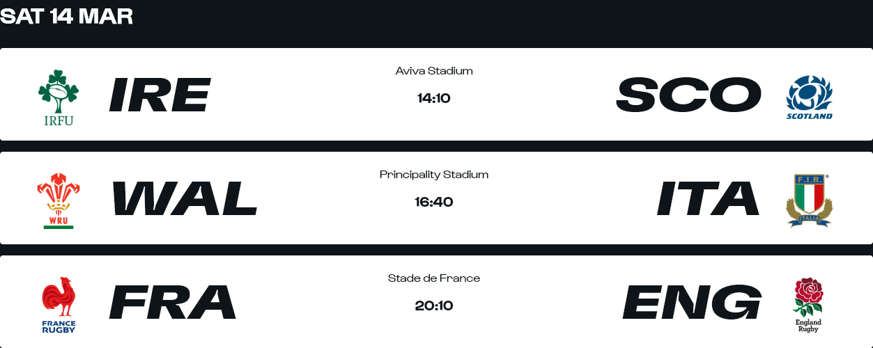 Round 4>Friday 6th March 202620:10 Ireland vs Wales, Lansdowne Road, Dublin>Saturday 7th March 202614:10 Scotland vs France, Murrayfield Stadium, Edinburgh17:40 Italy vs England, Stadio Olimpico, RomeAll Kickoff Times Local