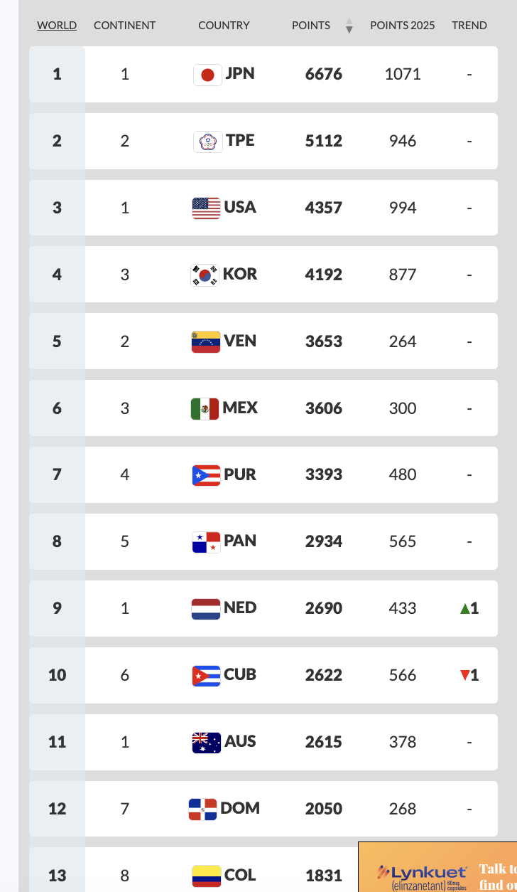 >>153760435>Points are awarded in the men's baseball rankings according to finishes in the Premier12, World Baseball Classic, U-23 Baseball World Cup, U-18 Baseball World Cup, U-15 Baseball World Cup and U-12 Baseball World Cup as follows.[18] These rankings were adjusted in 2025.[5][6]