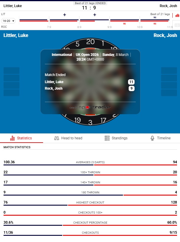 The 2026 Ladbrokes UK Open concludes on Sunday at Butlin's Minehead Resort. Who will be the 2026 UK Open champion?Coverage starts at 1:00pm UK time on ITV4.>Afternoon session (1:00pm - 5:00pm)Quarter-Finals (best of 19 legs [first to 10])Krzysztof Ratajski v Josh RockJames Wade v Rob CrossLuke Littler v Danny NoppertJonny Clayton v Gerwyn Price>Evening session (7:00pm - 11:00pm)Semi-Finals (best of 21 legs [first to 11])Final (best of 21 legs [first to 11])>Day 2 rounduphttps://www.pdc.tv/news/2026/march/07/Price-battles-back-from-brink/