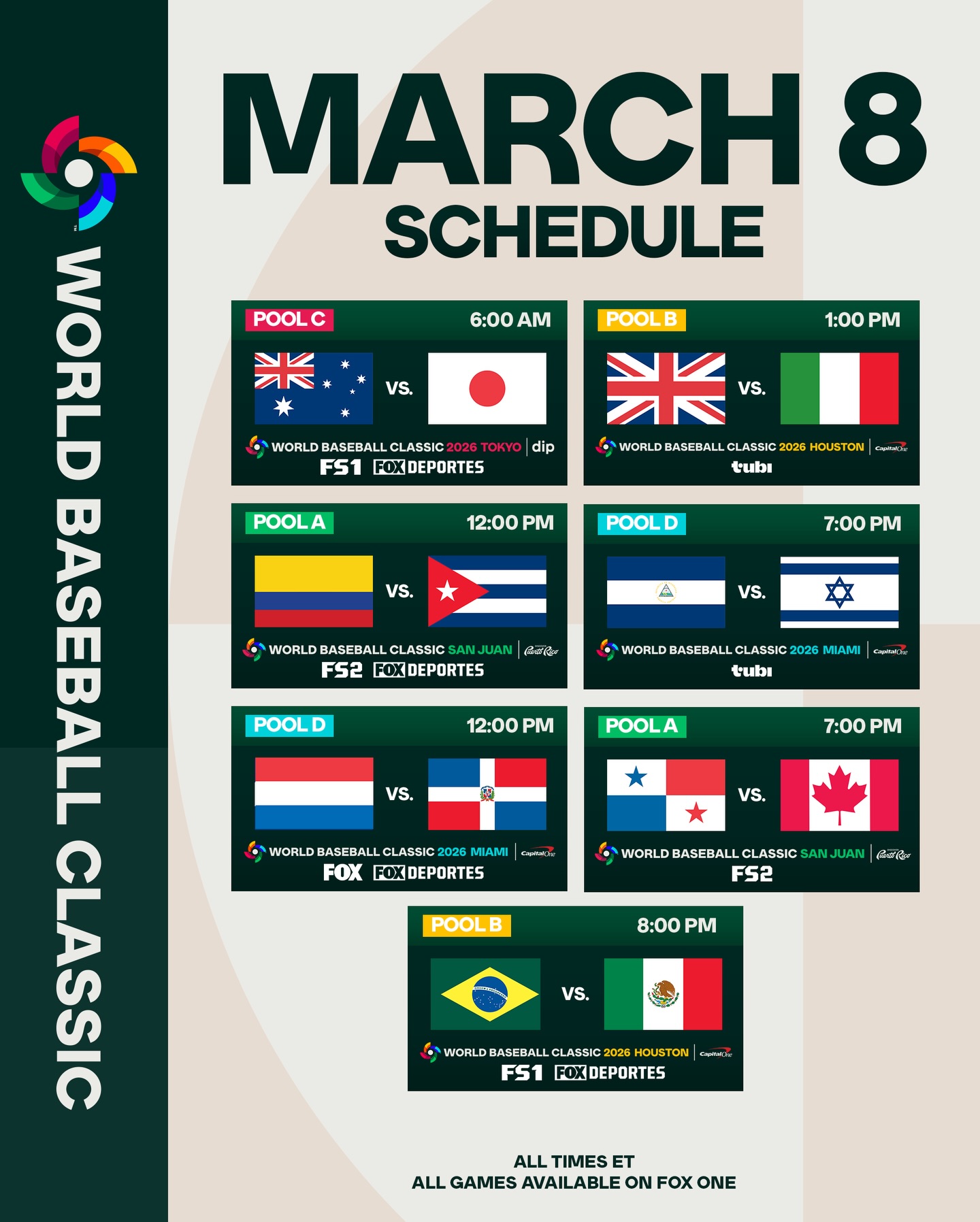 Sunday slateAfter a kind of disappointing first few days, the WBC has turned it up to 11 with several excellent games yesterday and this morningtoday's gamesAustralia 3 - 4 Japan, already overAustralia nearly pulled off the upset, they have looked very good this tournament and they look to continue their momentum and take care of business vs Korea late tonight (early Monday in Japan). Japan has looked a bit shaky, not entirely unexpected, their roster isn't quite as strong this yearColombia vs CubaColombia need to find something fast against Cuba if they want to stay alive or even just avoid relegation again. Cuba looked better than expected in their first game but they used their two best starting pitchers, their pitching depth looks very suspect.Netherlands vs Dominican RepublicNetherlands is coming off the high of their comeback and hope to feed off the momentum. They have a history of upsetting the DR, they look to do it again and cause chaos in pool D.Great Britain vs Italytwo decent teams of American mercs, should be a good game, both teams still have hopes of advancing to the next round.Nicaragua vs IsraelRelegation bowl. After suffering an absolute heartbreaker vs Netherlands yesterday, Nicaragua again tries to win their first ever WBC game. They've looked surprisingly competent and the crowd will be on their side, so they should be the favorites, but Israel isn't that bad either. Panama vs CanadaPanama also suffered a heartbreaker yesterday, they need a win today to stay alive. Canada is trying to prove they belong with the big boys of baseball.Brazil vs MexicoBrazil is probably the worst team in the WBC on paper but they've still been somewhat competitive in both their games and have avoided being mercy ruled. Mexico can't expect to just waltz through this one.streams on freestreamslive
