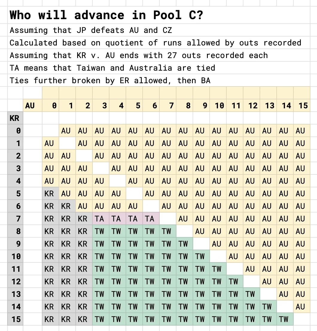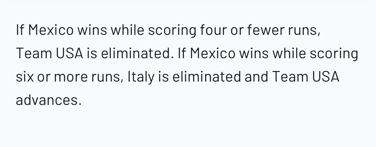 >>153818067Tiebreaker scenario if Mexico beats Italy tomorrow:MEX/US advance:Mexico scores 5+ runs.MEX/ITA advance:Mexico scores 4 runs of less. US/ITA advance:Italy win vs Mexico