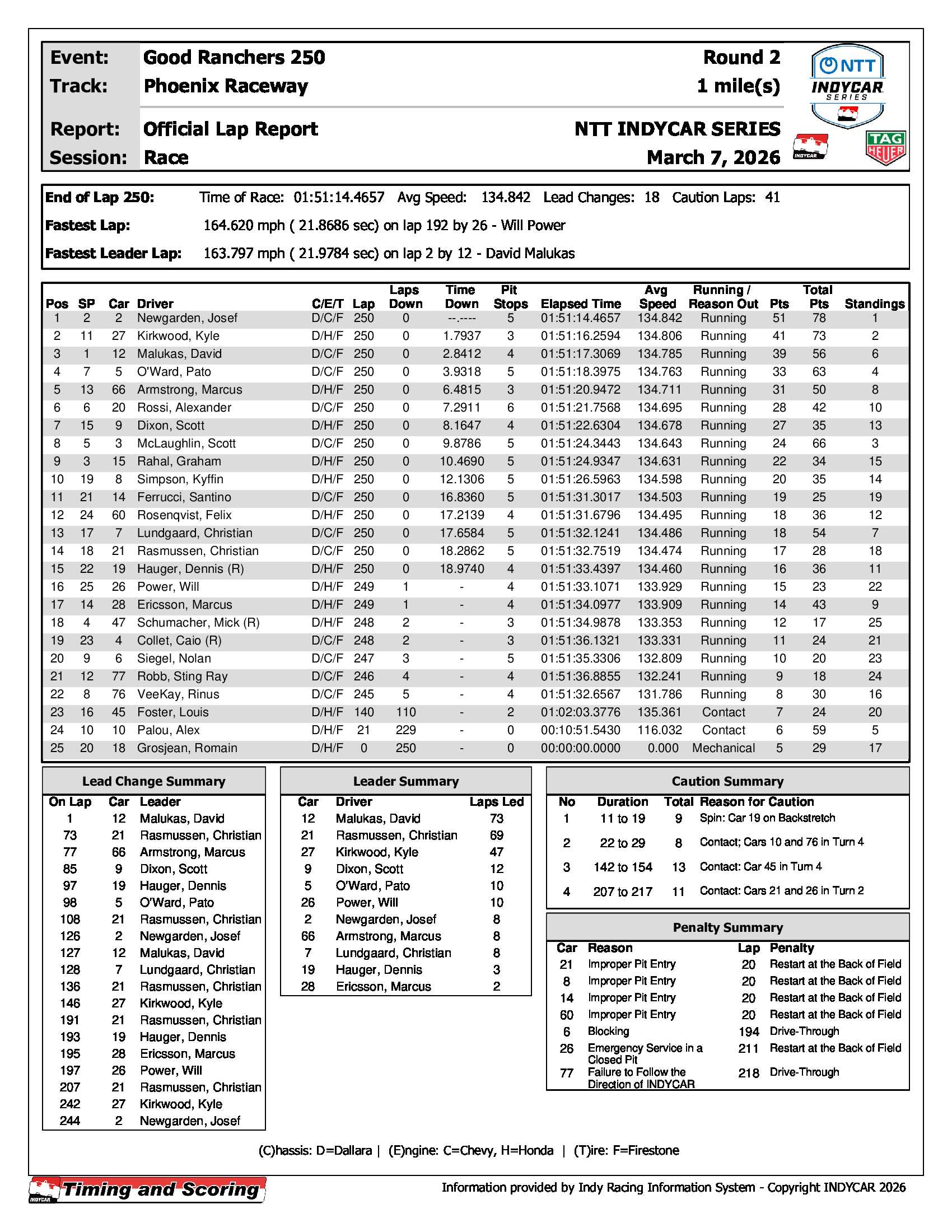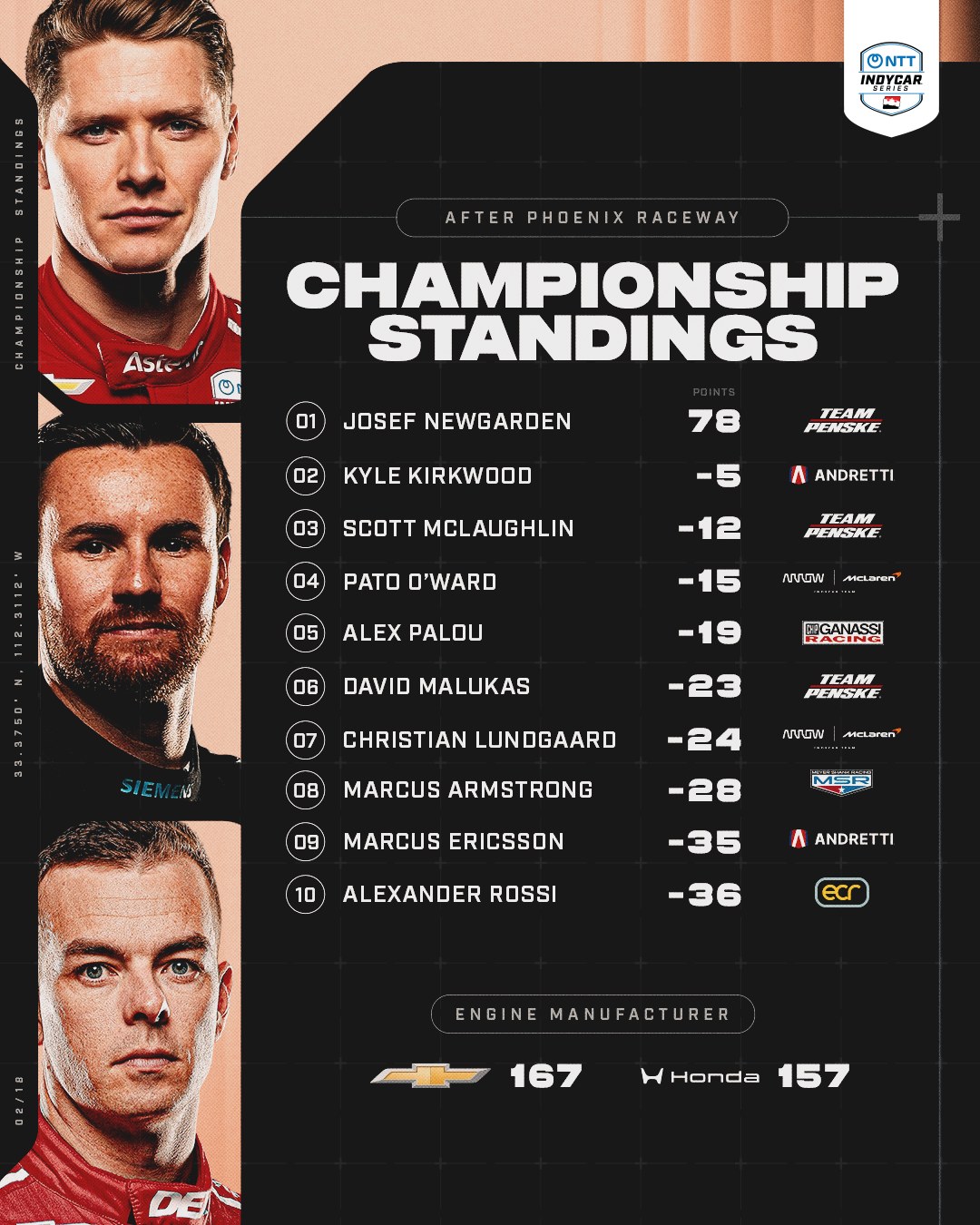 >INDYCAR>Recent RacesSt. Pete (Full Race)https://www.youtube.com/watch?v=qFeoTRihdGgPhoenix (Full Race)https://www.youtube.com/watch?v=m1xHOreGH4QPoles: McLaughlin (1), Malukas (1)Race Winners: Palou (1), Newgarden (1)
