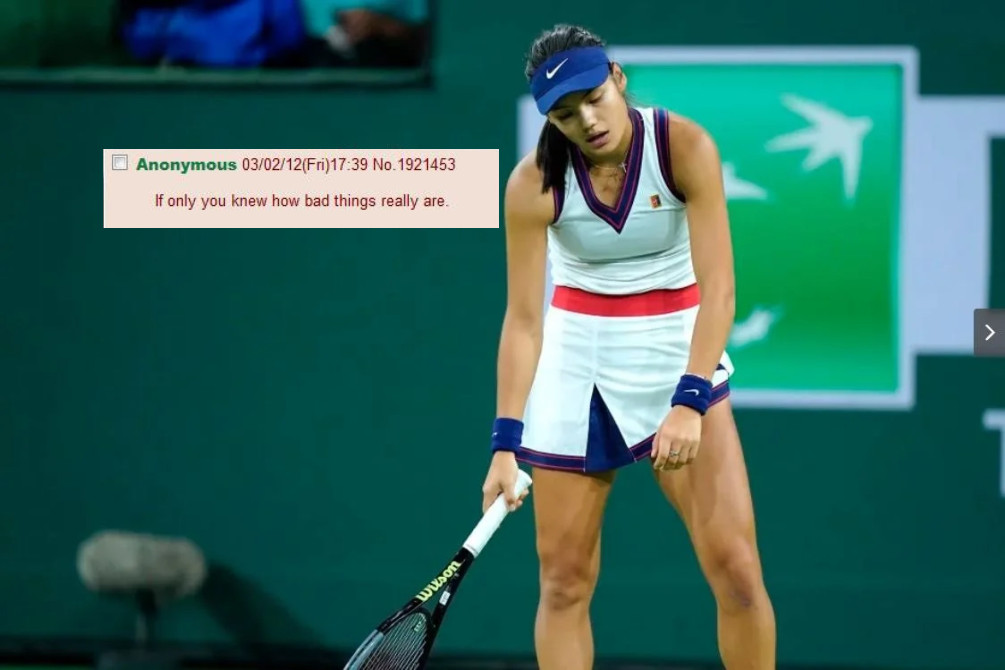 >>153794712>emma overpowered and dominated by the better, more experienced and bigger chested player in 52 minutesImagine if this were OnlyFans instead of Indian Wells, really think Emma needs to consider the career change at this point.