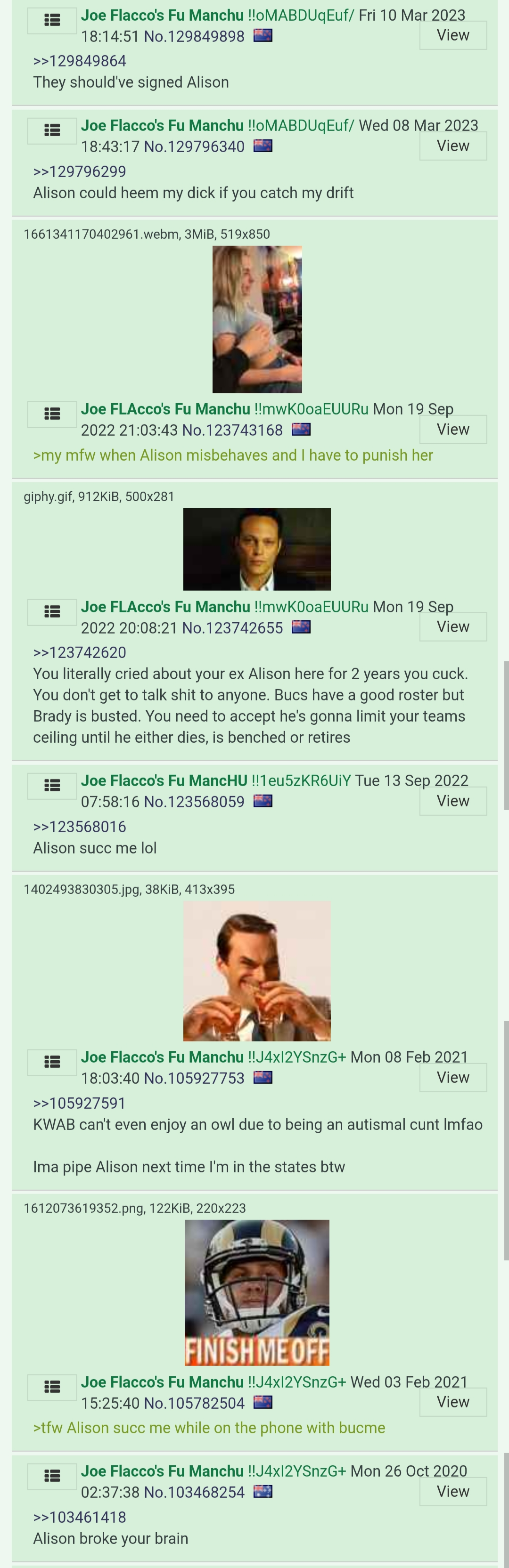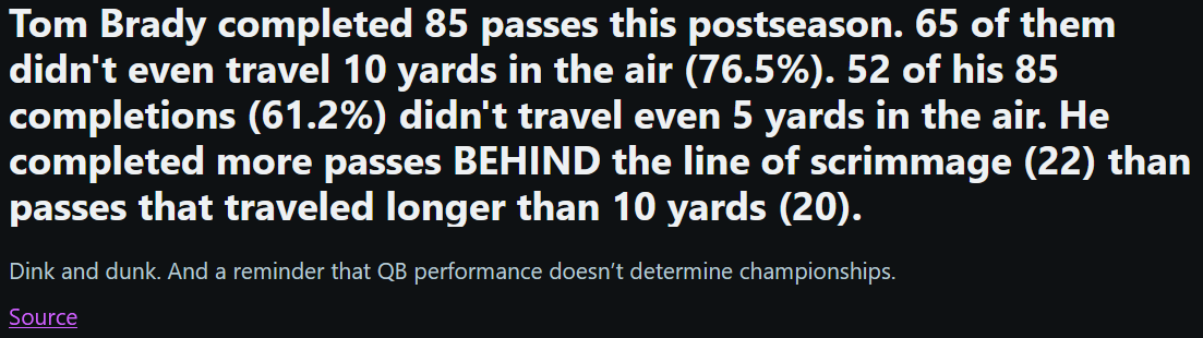 Unfortunately I can't even fully appreciate that owl run because retards fully attribute it to Brady even though he played average at best in every game after round one. He spent the entire second half of the NFCCG throwing the game away and in the owl he really didn't have to do anything because of what the defense did to Mahomes.