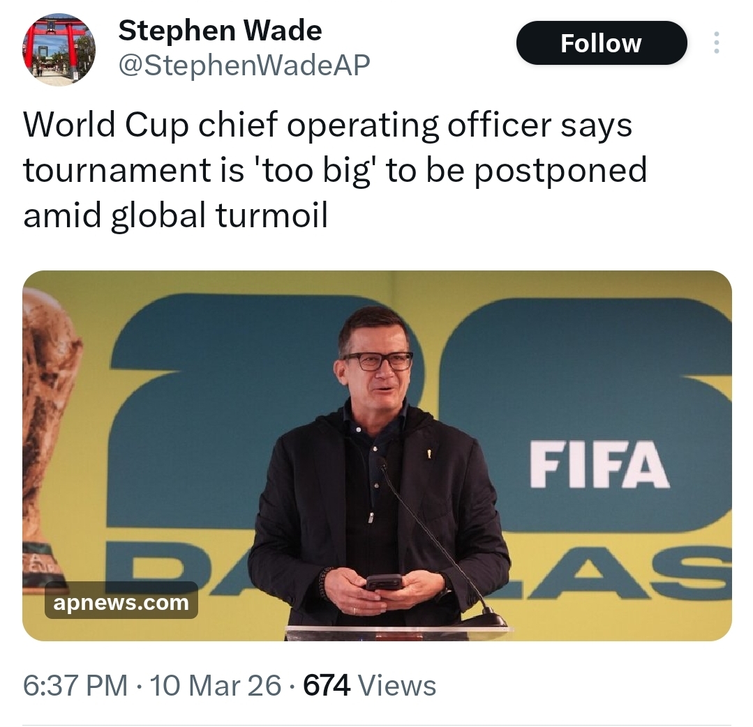 Americans are rather litigious. E.g.>MLS settle suit in missed Lionel Messi game.>The lead plaintiff, Ho Chun, filed the claim alleging that the league and club exploited the expectation that star Inter Miami CF players like Lionel Messi, Luis Suárez, Sergio Busquets and Jordi Alba would participate in the MLS match to sell tickets.>Head coach Gerardo Martino chose to rest the players due to calendar congestion.>The court ordered the defendants to collectively pay a total $329,000 to settle the lawsuit and must revise their ticketing terms, adding language to state the following information: "Ticketholder hereby recognizes and acknowledges that team rosters and player lineups are subject to change at any time prior to, or during, the Event.These fans sued their club and mls despite their team facing a weakened Miami. Imagine the amount of legal challenges if WC26 wouldn't go ahead. With the Iran boycott and most tickets having been sold for their games in LA, already might get a big lawsuit.