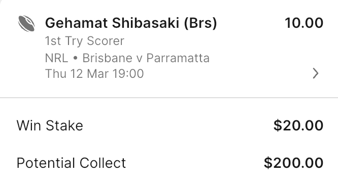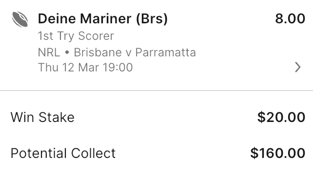 Trouble in paradise editionNRL>GAME 1Brisbane Broncos v Parramatta Eels8:00pm AEDST on Fox, Kayo and Ch9Suncorp Stadium, Brisbane1.25-4.00>Round 2 begins with the defending premiers looking to reverse last year's Round 21 upset by the Eels as Suncorp Stadium hosts a massive Thursday night encounter between two clubs desperate to erase memories of heavy Round 1 defeats. The Broncos endured a humbling start to their campaign, suffering a 0-26 shutout against the Penrith Panthers in front of their home fans. It was a stark departure from the high-energy football that defined their 2025 season, and coach Kevin Walters has responded by immediately reshuffling his spine to spark more creativity. The Parramatta Eels sit at the foot of the ladder following a devastating 4-52 thrashing by the Melbourne Storm. Their edge defence was particularly vulnerable, conceding nine tries in a performance that lacked physical intensity. The Eels now face the daunting prospect of an 0-2 start if they cannot rectify their structures before travelling to Brisbane. The Broncos have moved Ben Hunt to the bench, allowing Ezra Mam to return to the starting five-eighth role to partner Adam Reynolds. The Eels receive a boost with the return of Josh Addo-Carr, who has been cleared to play following thumb surgery His presence on the wing provides much-needed finishing ability for a side that managed only one try last week. In their most recent meeting in Round 21, 2025, the Eels secured a narrow 22-20 victory over the Broncos. Historically, Brisbane holds the advantage with 39 wins to Parramatta's 29, though the Eels have shown they can win at Suncorp Stadium with three victories in their last five visits. Broncos 1-12 3.25Broncos 13+ 1.87Eels 1-12 5.00Eels 13+ 11.50Broncos -12.5 1.91 Eels +12.5 1.89