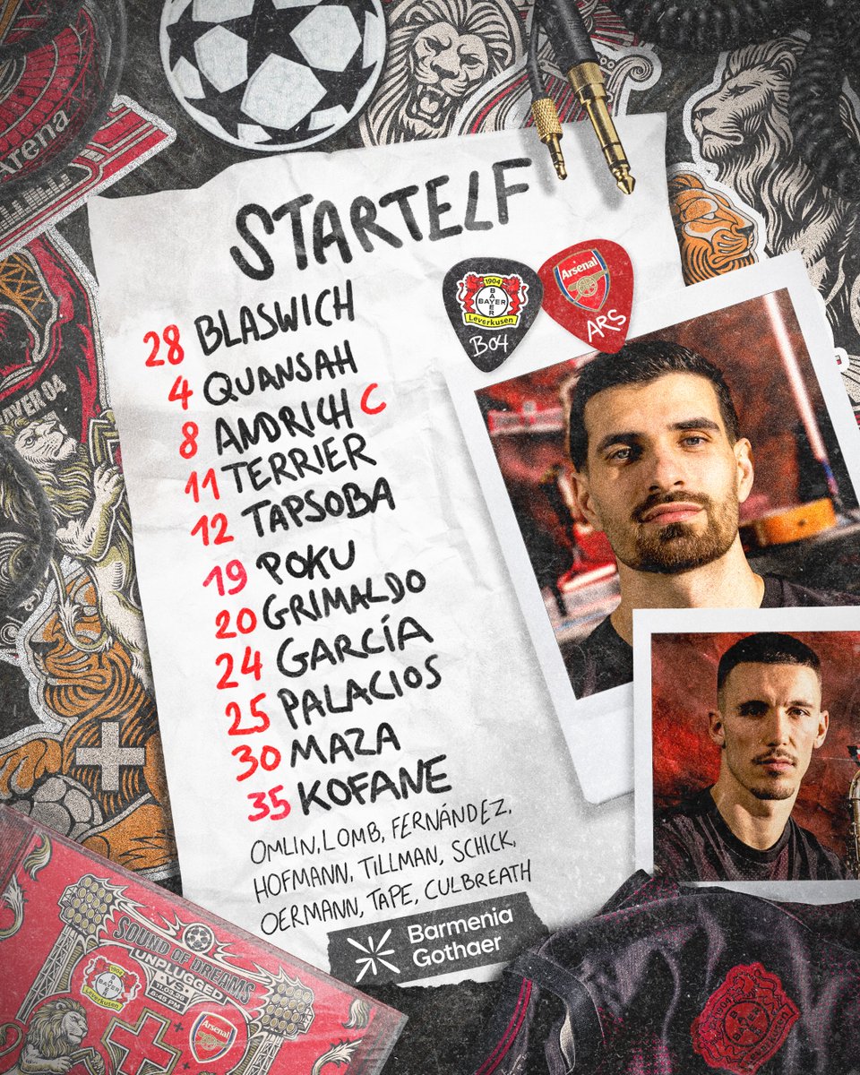 KO IN 40 BINGSBayer Leverkusen (3-4-2-1) Blaswich; Quansah, Andrich, Tapsoba; Poku, Palacios, Garcia, Grimaldo; Terriera, Maza; Kofane.>Subs: Omlin, Lomb, Fernandez, Hofmann, Tilmann, Schick, Oermann, Tape, Culbreath.Arsenal (4-3-3) Raya; Timber, Saliba, Gabriel, Hincapie; Eze, Zubimendi, Rice; Saka, Gyokeres, Martinelli.>Subs: Arrizabalaga, Ranson, Mosquera, White, Jesus, Norgaard, Madueke, Havertz, Calafiori, Lewis-Skelly, Dowman, Salmon.