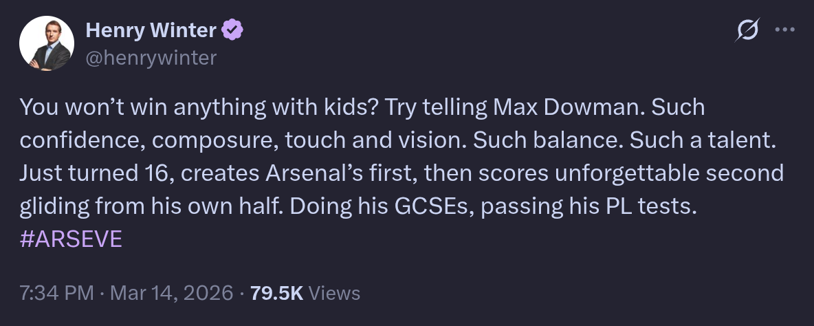 FACT: Max Dowman, 16, has scored more Premier League goals in 2026 than Spurs have wins