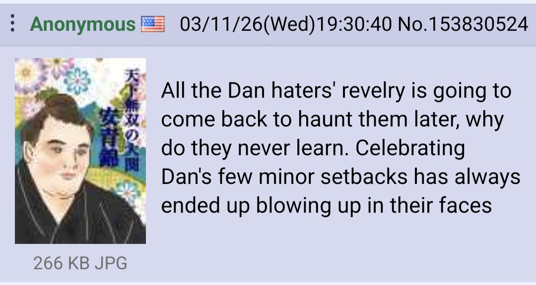 >>153818759>No one left has anything for DanThis lesson to be taken away here is that while Dan is very good, he's not unbeatable. All of the people who had beaten Dan this basho prior to today have beaten Dan before. Today Atamifuji beat Dan for this first time, proving that people can adapt to his style.