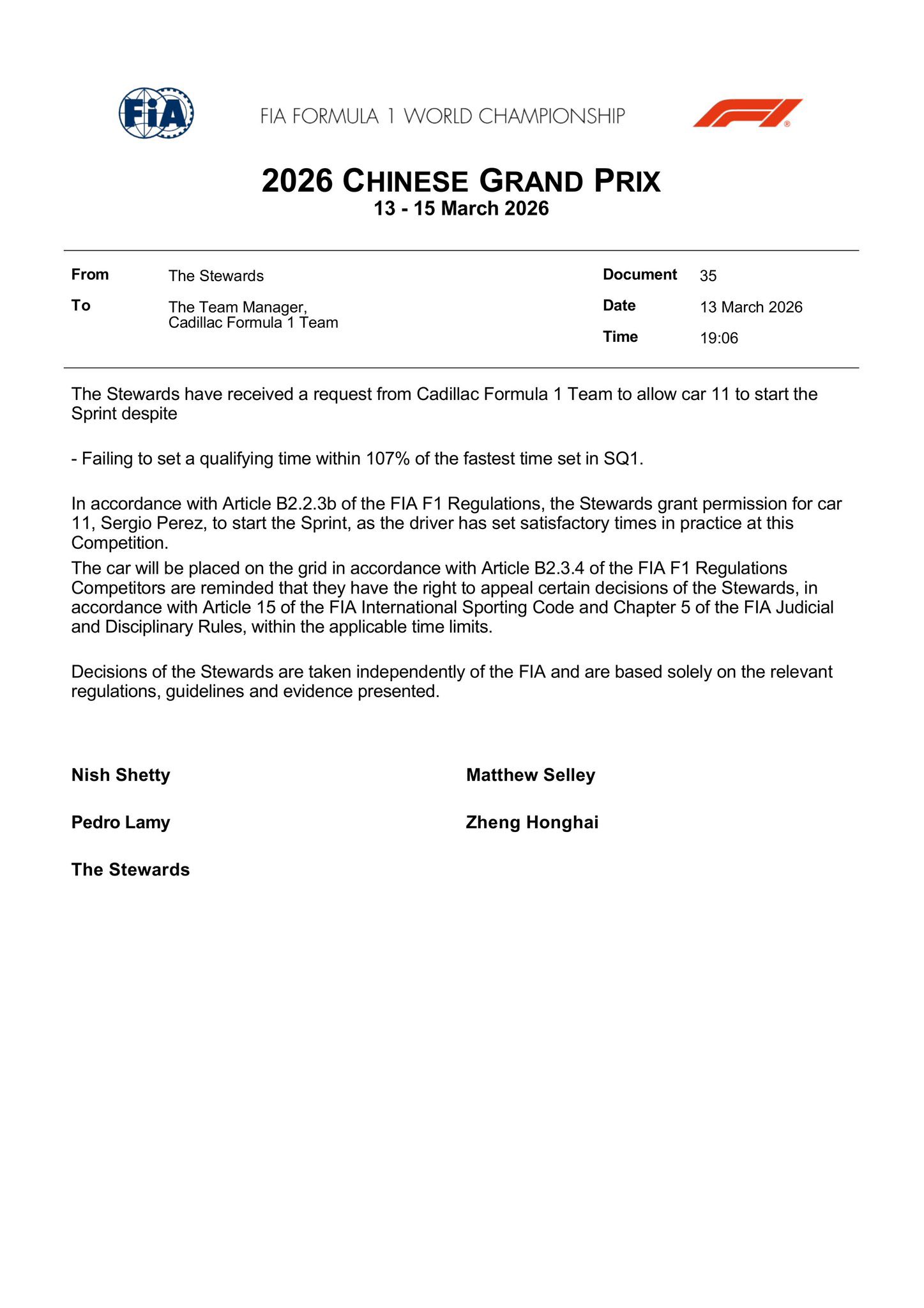 >>FIADocsBotFORMULA 1® HEINEKEN 0.0 GRAND PRIX 2026VIP access pass to the F1® Paddock - requests by team[Amended 12 Mar 2026]>McLaren Mastercard F1 TeamMr. Fang Shilong (to be captioned ‘Jackie Chan - actor and martial artist’)Mercedes-AMG Petronas F1 TeamMr. Wang Ka-yee (to be captioned ‘Jackson Wang’)>Oracle Red Bull RacingMiss Eileen Feng Gu (to be captioned, for Asian markets, as ‘Gu Ailing (谷爱凌) - Chinese Gold Medal Winning Olympian’)Miss Lalisa Manobal (to be captioned ‘Lisa’)>Scuderia Ferrari HPMiss Emily Rudd (NETFLIX ONE PIECE GRID EVENT)Mr. Iñaki Godoy (NETFLIX ONE PIECE GRID EVENT)>Atlassian Williams F1 TeamMr. Jeremy ClarksonMr. James Daniel MayMr. Kaleb Cooper (plus family x4)>Visa Cash App Racing Bulls F1 TeamMr. Zeng Wenhui>Aston Martin Aramco F1 Team[no requests made]>TGR Haas F1 TeamMiss Kaho Shibuya (MONARCH: Apple TV event)Mr. Anna Sawai (MONARCH: Apple TV event)Mr. Kurt Vogel Russell (MONARCH: Apple TV event)>Audi Revolut F1 TeamMs. Alexandra Daddario>BWT Alpine F1 TeamMr. Carlos Ghosn (Box, Box, Box Pit Lane Event)>The Cadillac Formula 1 TeamMr. Ke Huy QuanMiss Lucy Alexis LiuMiss Nora Lum (to be captioned ‘Awkwafina’)