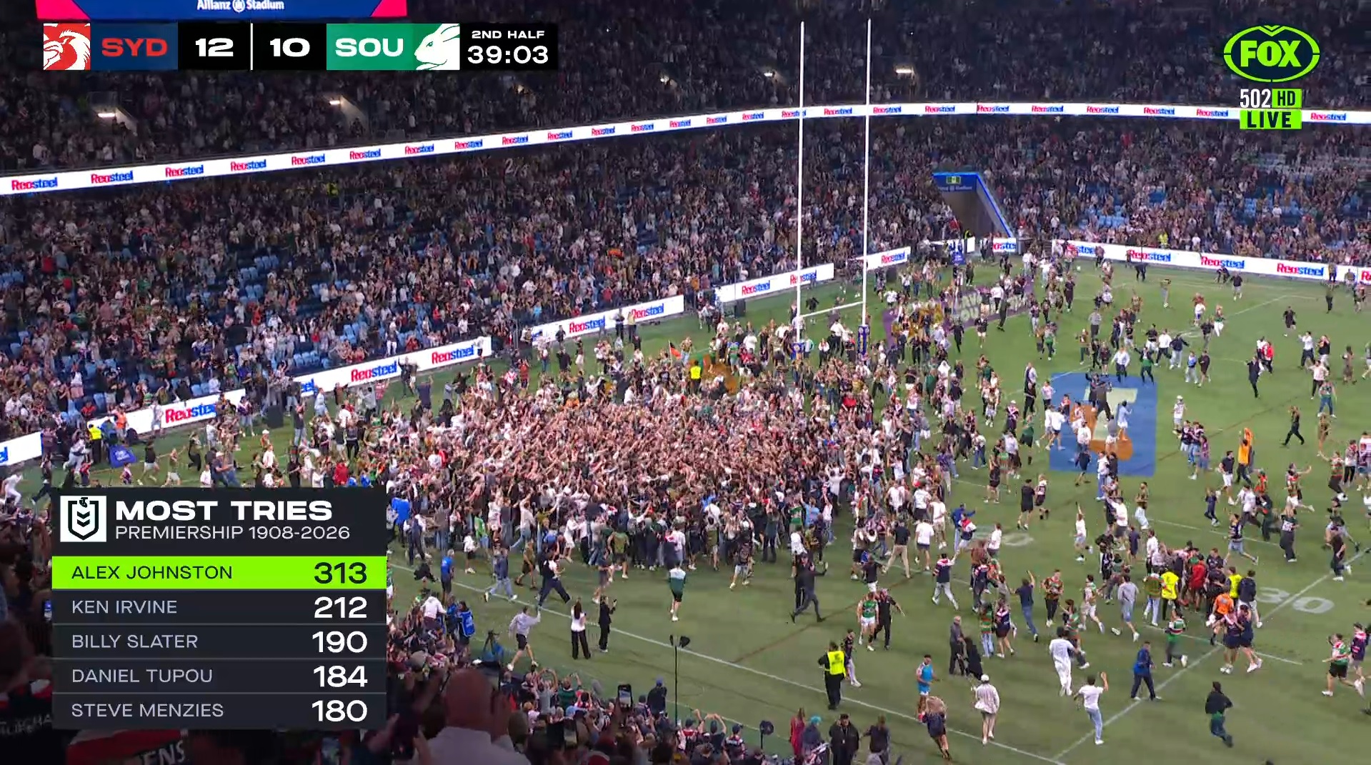 All-Time Top Tryscorers (As at the end of each year)Horrie Miller (1908-09)Tommy Anderson & Dan Frawley (1910)Arthur McCabe (1911)Dan Frawley (1912-15)Frank Burge (1916-22)Harold Horder (1923-68)Ken Irvine (1969-2025)Alex Johnston (2026-)