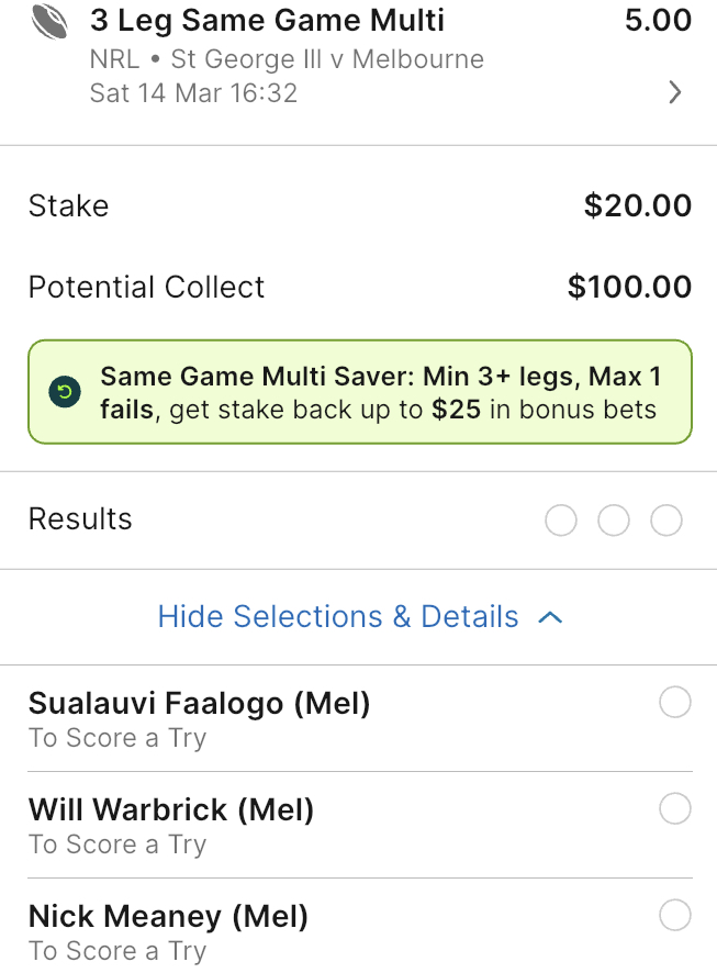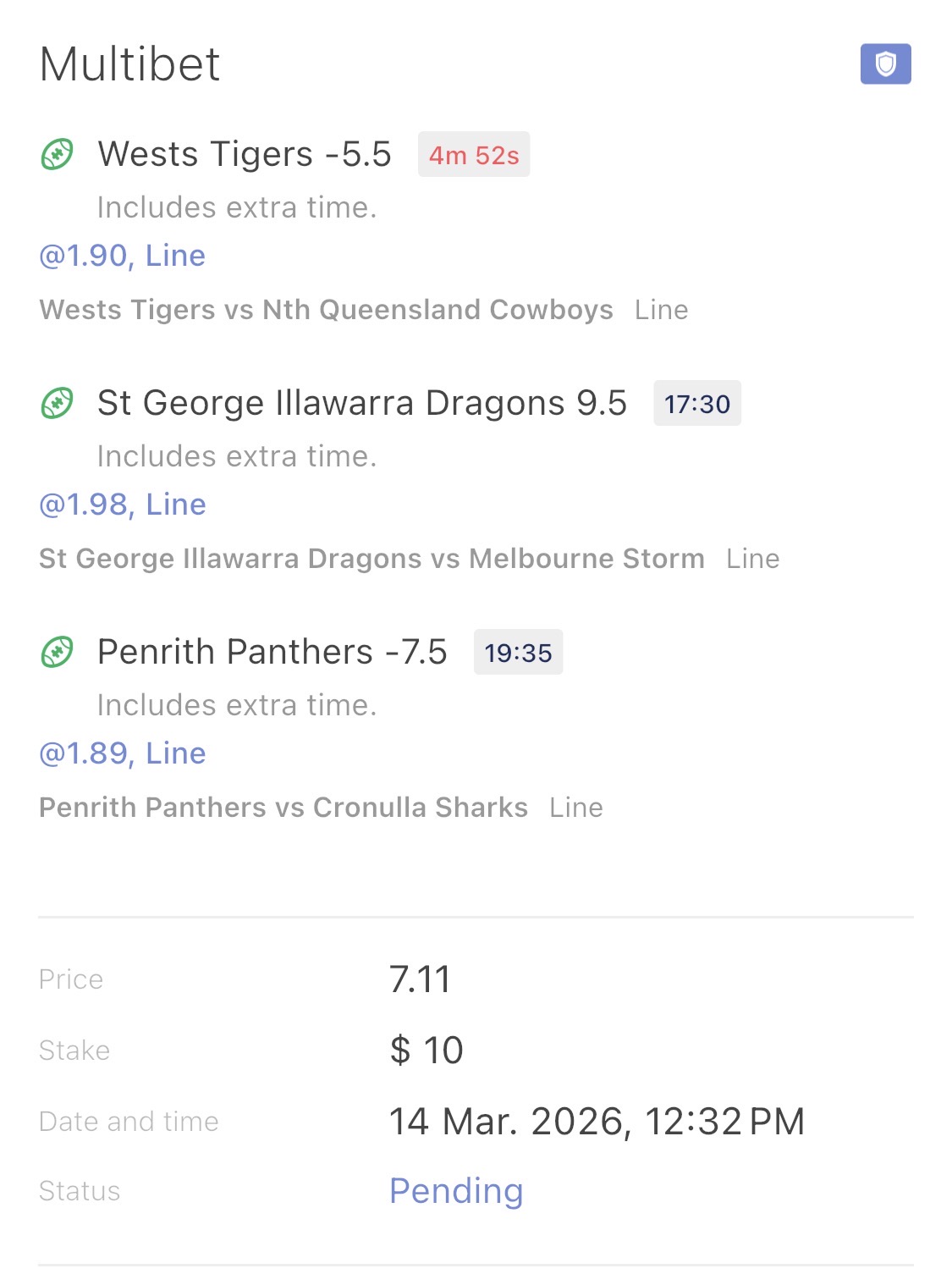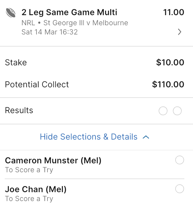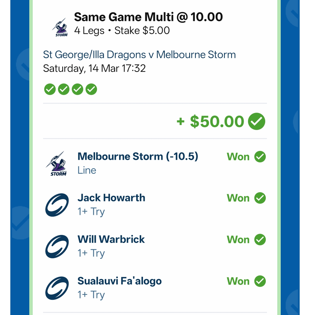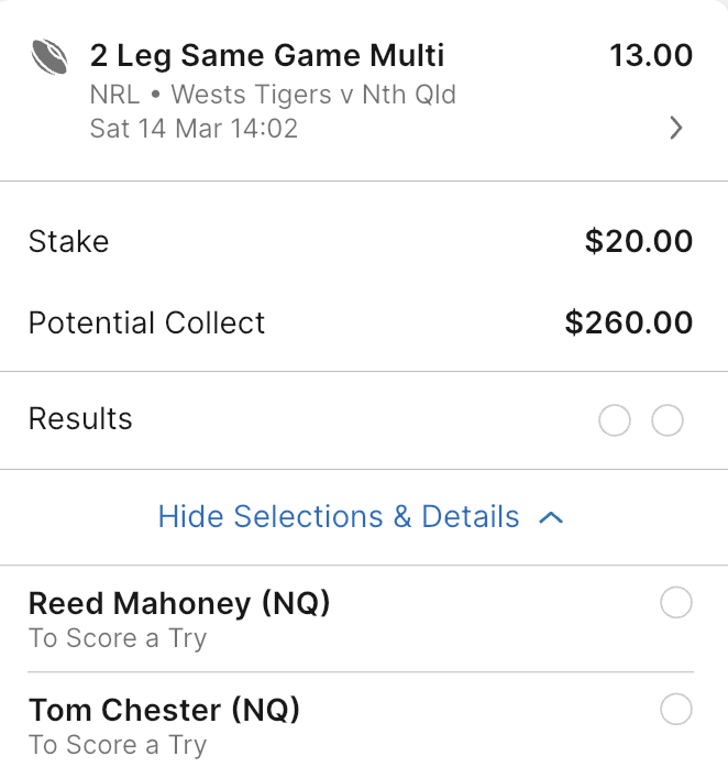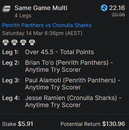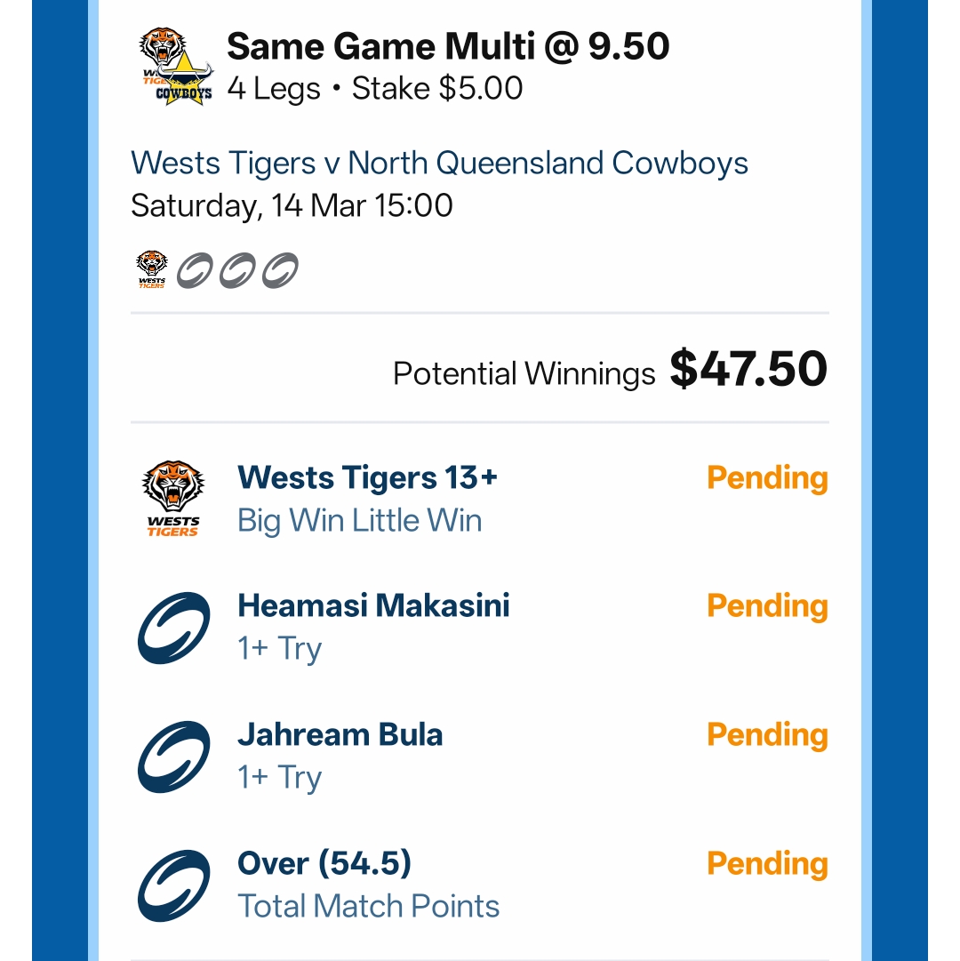 Country roads editionNRL>GAME 1Wests Tigers v North Queensland Cowboys3:00pm AEDST on Fox and KayoLeichhardt Oval1.52-2.52>Leichhardt Oval will host a Saturday afternoon special as the Wests Tigers make their 2026 season debut against the North Queensland Cowboys. The Cowboys held the advantage in 2025, winning both encounters. The Wests Tigers have a strong historical record at Leichhardt Oval, winning 9 of 13 matches played against North Queensland at the venueTigers 1-12 3.10Tigers 13+ 2.60Cowboys 1-12 3.60Cowboys 13+ 6.25Tigers -5.5 1.86 Cowboys +5.5 1.95>GAME 2St George Illawarra Dragons v Melbourne Storm5:30pm AEDST on Fox and KayoWIN Stadium3.29-1.34>WIN Stadium in Wollongong will host a Saturday evening clash as the St George Illawarra Dragons host the top-of-the-ladder Melbourne Storm. The Dragons have proved to be a bogey team for the Storm recently, winning 14-8 in 2025 and 18-16 in 2024. Overall, Melbourne has dominated the long-term history between the two clubsDragons 1-12 4.20Dragons 13+ 9.75Storm 1-12 3.00Storm 13+ 2.15Dragons +9.5 1.98 Storm -9.5 1.83>GAME 3Penrith Panthers v Cronulla Sharks7:30pm AEDST on Fox and KayoCarrington Park1.42-2.90>Carrington Park in Bathurst will host a blockbuster Saturday night clash as the Penrith Panthers host the Cronulla Sharks. The Panthers began their campaign with a clinical defeat of the Brisbane Broncos. Their defence was flawless, and they controlled territory through Nathan Cleary’s superior kicking game, holding the premiers scoreless for the first time in two years. The Sharks produced a high-octane 50-10 victory over the Titans last Saturday. Nicho Hynes and Braydon Trindall both scored doubles in a performance that showcased the Sharks' attacking potential. The Panthers have held a significant advantage over the Sharks in recent years, winning 28-22 in March 2025 Panthers 1-12 2.80Panthers 13+ 2.50Sharks 1-12 3.80Sharks 13+ 7.50Panthers -7.5 1.89 Sharks +7.5 1.91