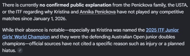 >>153883287Their parents were both pros, they've been playing tennis for 12 years at this point and are on the USTA pathway with massive hype around Kris in particular, they're at the serious business end of junior tennis, also we're not talking about them having a week off, they've been completely off the radar for about four months.Sure, they might just be doing training blocs but for Kris in particular she'd probably have been in the frame for qualifying wildcards this year as the year end junior #1. It's unusual.