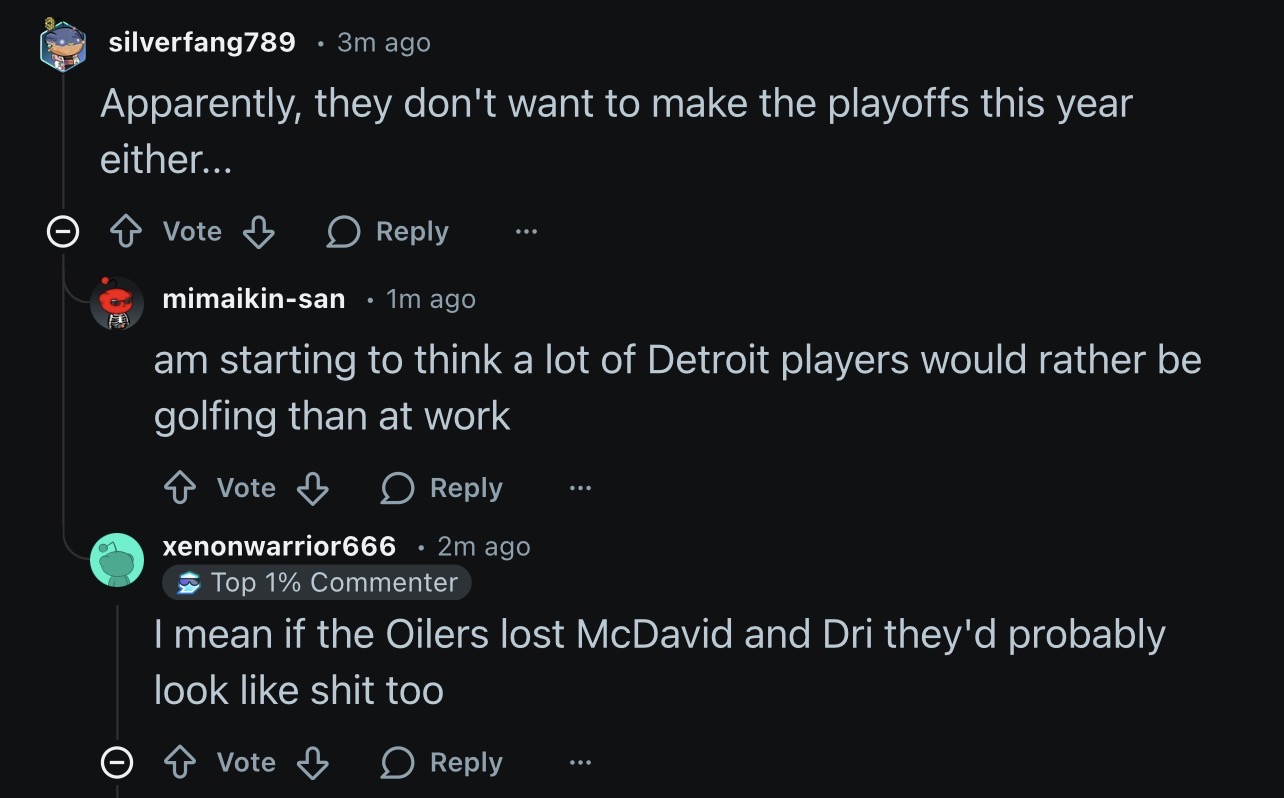 >Larkin and Copp (an AHL player on a cup contending team) are their equivalent to McDavid and Draifraud wings fans are the most delusional and softest fans in the league