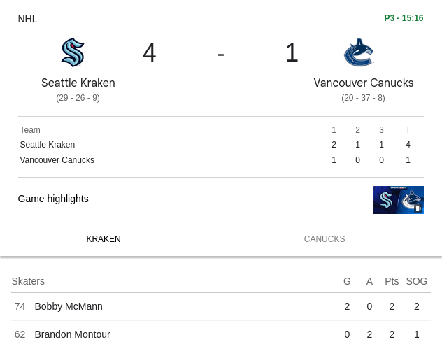 >>153873244Bedard got his feelings hurt by VGK so they have been getting into scrums and they just gave up a goal.