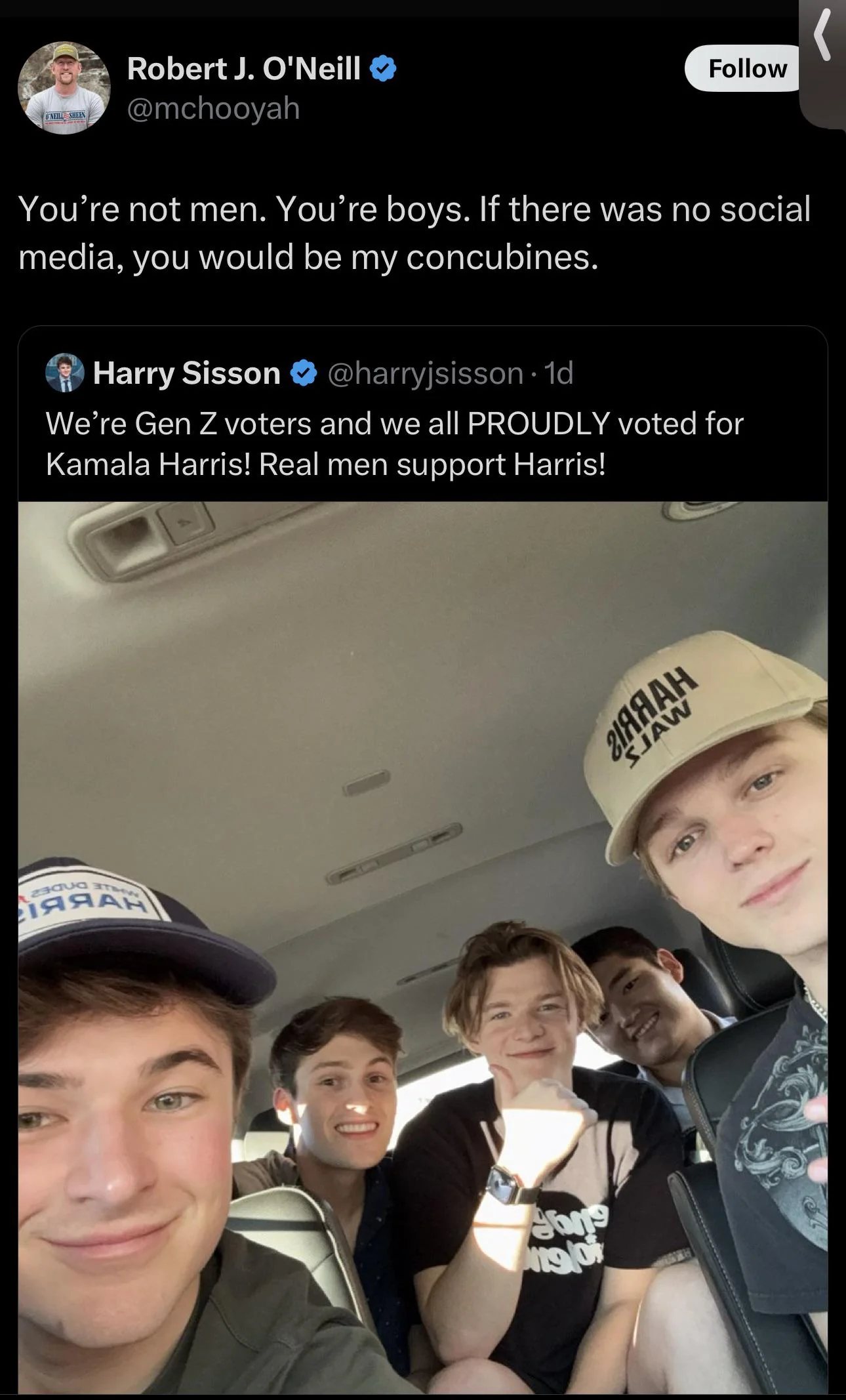 >O'Neill tweeted a selfie of himself seated aboard a Delta Air Lines plane without a face mask; it was captioned "I'm not a pussy" and was followed by another that said, "Thank God it wasn't @Delta flying us in when we killed bin Laden ... we weren't wearing masks".