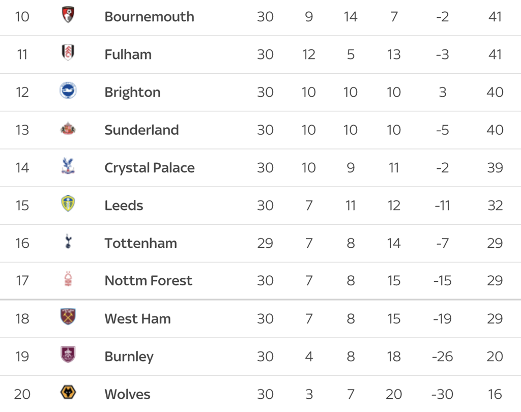 >Despite their hard-fought draw, Tottenham Hotspur have now gone 12 games without a league win in 2026. Only three teams have waited longer for their first PL victory in a calendar year - Derby County (2008), Sunderland (2003) and Middlesbrough (2017). All three teams were relegated...