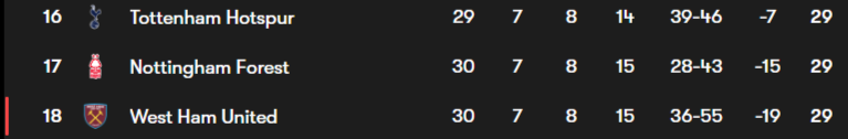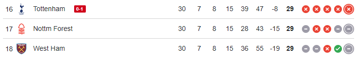 spurs forest and west ham al on 29 points now wew