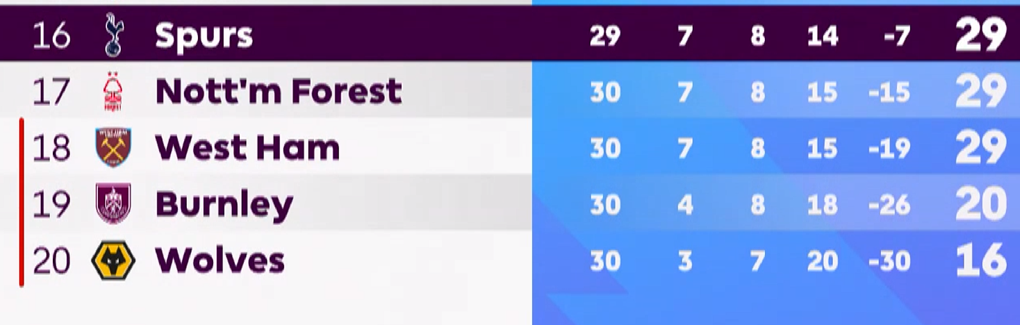 >>153883261Spurs, Forest and West Ham all already have more points than last seasons bottom 3