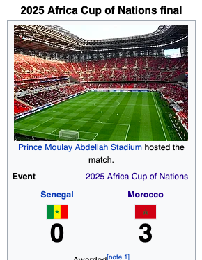 If I was Moroccan I would not be celebrating winning this way, its just an unsavoury way of winning a title. The decision is correct and CAS will probably throw out the Senegalese case because the burden of proof is on them.